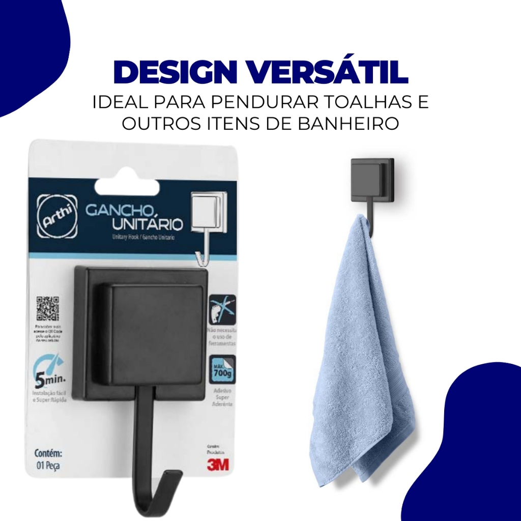 Gancho Cabide Porta Toalha de Rosto Parede Lavabo Banheiro Fixação Dupla Face 3M Sem Furos Preto Com design classico e elegante, o gancho cabide e ideal para organizar seu banheiro ou cozinha. A fixacao e atraves de fita adesiva dupla face 3M extra fortes, sem o uso de ferramentas e furadeira. Alem do tradicional tratamento superficial da Arthi os produtos sao revestidos com uma camada extra do protetivo especial, garantindo cores vivas, alem de maior resistencia contra ferrugem. Especificacao Tecnica: . Fabricante: Arthi . Tamanho (CxLxA): 6 x 5 x 11 cm . Cor: Preto Instalacao: Correto: superficies lisas, brilhantes e totalmente planas como vidros, espelhos, azulejos, ceramicas nao porosas, pinturas lisas e brilhantes (epoxi) e laminados. Incorreto: superficies curvas e porosas, como papel de parede, couro, cimento, madeira, etc. Fixacao: . Limpar a superficie com pano limpo e alcool. . Retirar o Papel Protetor Adesivo. . Colar o gancho cabide toalha e segurar por 10 segundos. . PRONTO, agora aguarde 1 hora ate o adesivo fixar 100%. Conteudo da Embalagem: . 01 Gancho Importante: Garantia de 3 Meses. Valor Unitario. Imagens Meramente Ilustrativas. Nao nos responsabilizamos pelo mau uso do produto