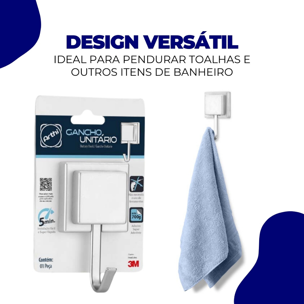 Gancho Cabide Suporte Porta Toalha de Rosto de Parede Banheiro 3M Sem Furo Cromo Fosco Arthi Com design classico e elegante, o gancho cabide e ideal para organizar seu banheiro ou cozinha. A fixacao e atraves de fita adesiva dupla face 3M extra fortes, sem o uso de ferramentas e furadeira. Alem do tradicional tratamento superficial da Arthi os produtos sao revestidos com uma camada extra do protetivo especial, garantindo cores vivas, alem de maior resistencia contra ferrugem. Especificacao Tecnica: . Fabricante: Arthi . Tamanho (CxLxA): 6 x 5 x 11 cm . Cor: Cromo Fosco Instalacao: Correto: superficies lisas, brilhantes e totalmente planas como vidros, espelhos, azulejos, ceramicas nao porosas, pinturas lisas e brilhantes (epoxi) e laminados. Incorreto: superficies curvas e porosas, como papel de parede, couro, cimento, madeira, etc. Fixacao: . Limpar a superficie com pano limpo e alcool. . Retirar o Papel Protetor Adesivo. . Colar o gancho cabide toalha e segurar por 10 segundos. . PRONTO, agora aguarde 1 hora ate o adesivo fixar 100%. Conteudo da Embalagem: . 01 Gancho Importante: Garantia de 3 Meses. Valor Unitario. Imagens Meramente Ilustrativas. Nao nos responsabilizamos pelo mau uso do produto