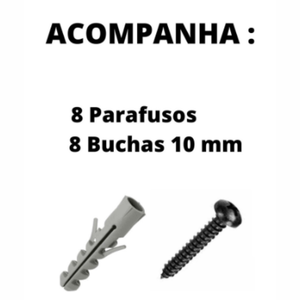 Altamente resistente, pode ficar na chuva que não enferruja. O Kit acompanha: - 2 Ganchos de aço reforçados - 8 Parafusos PHILIPS PRETOS - 8 Buchas 10 MM para maior segurança ==================================== Características e especificações: - Produto: Kit Gancho de rede Reforçado com Parafusos e Buchas - Cor: Preto - Material: Aço - Comprimento: 10cm - Largura: 6,5 cm