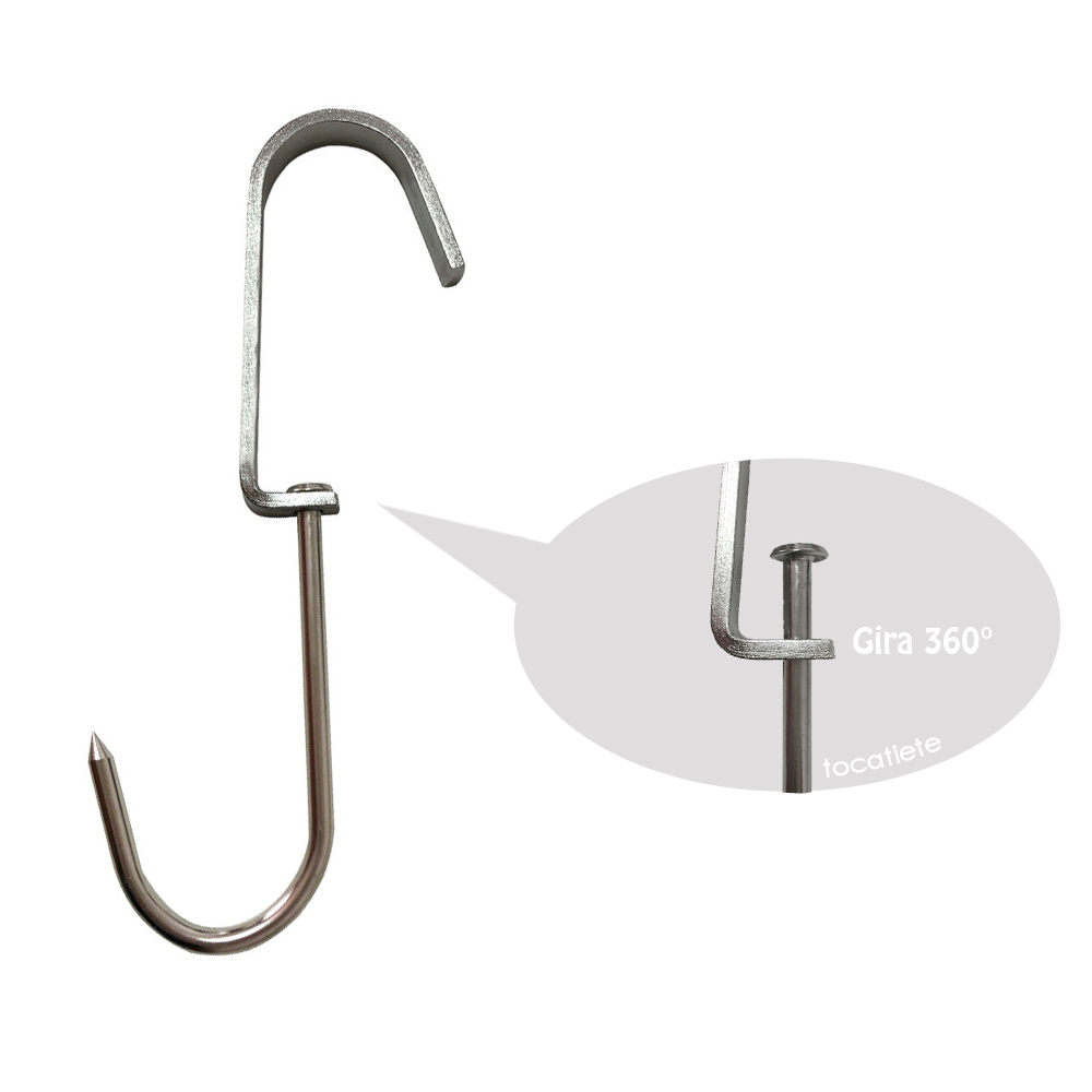 GANCHO GIRATÓRIO PEQUENO PICELLI - AÇO ESTANHADO Usado em açougues e também em frigoríficos, para pendurar dianteiro/traseiro de porco. Permite o giro de 360° com a peça da carne. ESPECIFICAÇÕES: Material: aço estanhado Comprimento: 32 cm Peso unitário: 400 g Peso Suportado: 100 kg cada ITENS INCLUSOS NESTE ANÚNCIO: 1 gancho giratório P aço estanhado [Imagens Meramente Ilustrativas]