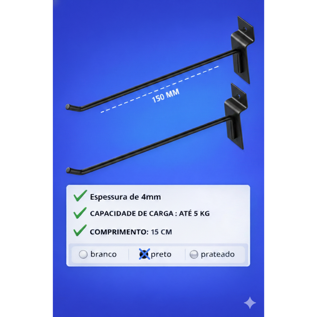 GANCHO PARA PAINEL CANALETADO 15 Cm DIRETO DA FÁBRICA* Gancho Pintado na cor Preta Produto com alto padrão de qualidade, podem ser expostos em vários ambientes, como mostruários/ expositor de produtos diversos. Gancho para painel Canaletado ( MDF ) . Material: Metal , aço carbono Cor Preto Medida do Gancho 15 cm Espessura : 4.00 mm Condição: novo Kit com 100 pçs