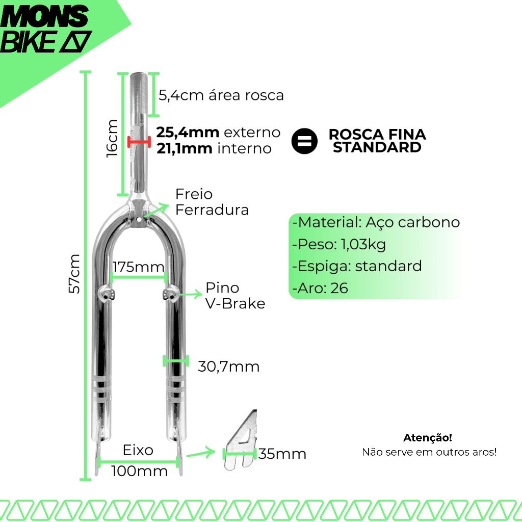 Garfo Bicicleta Aro 26 Standard 21,1mm Cromado Bike Mtb Fixo Freio V-Brake E Ferradura