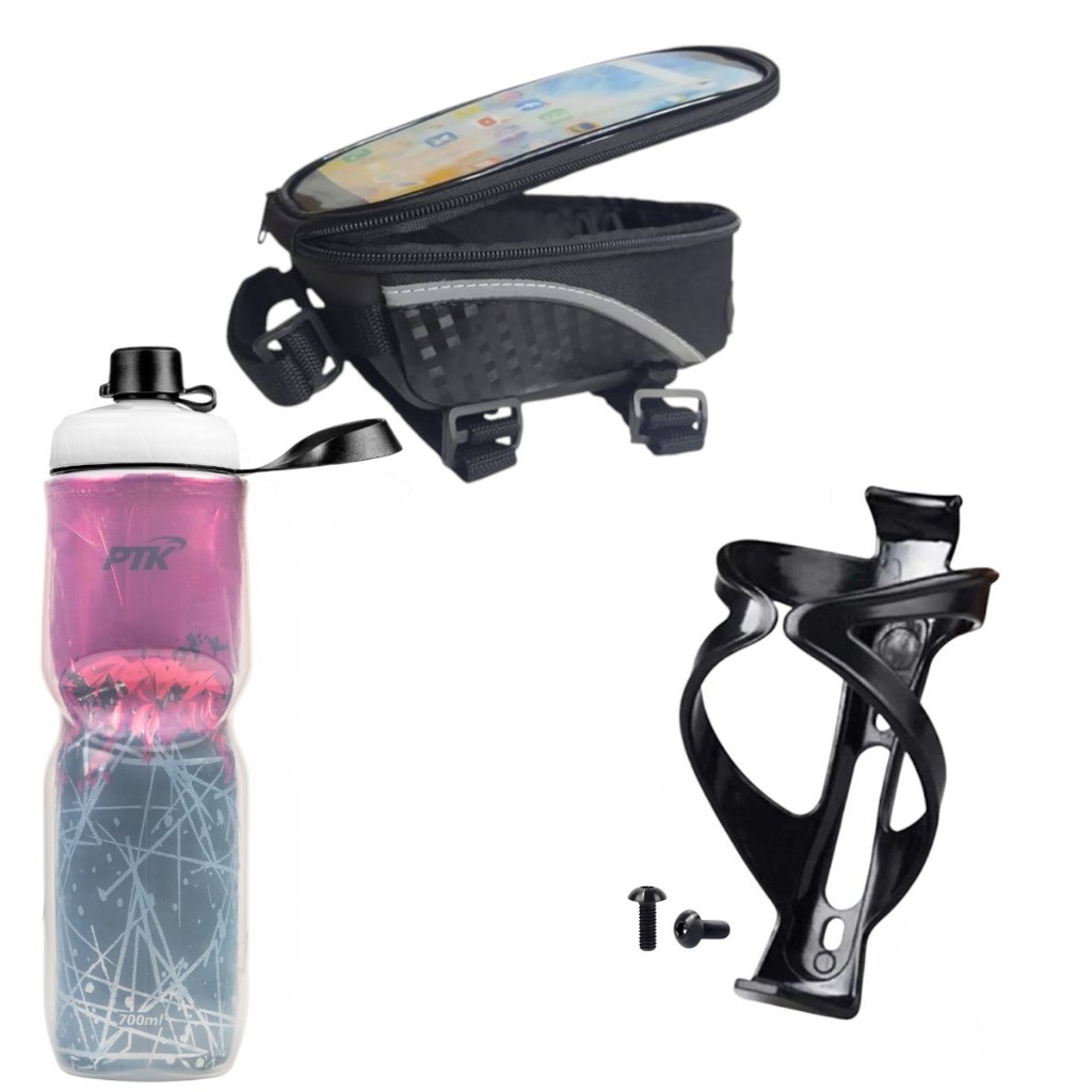 Garrafa Térmica Rastro 700ml Ideal para a prática de exercícios! Para ciclismo, corrida, ginástica e várias outras atividades esportivas; Alça de segurança; protetor Higiênico de bico; Alto desempenho em isolamento térmico de até 3h; Flexibilidade para apertar aumentando o fluxo da água; Boca larga que facilita a limpeza e abastecimento; CARACTERISTICAS: Garrafa Térmica: Marca: PTK Material: Polipropileno Parede Térmica mantem a temperatura por até 3 horas Peso: 130g Modelo: Rastro 700 Capacidade: 700ml Térmica: Sim Livre de BPA: Sim Altura: 26,5cm Comprimento da Circunferência: 24cm Diâmetro da Circunferência: 7cm Compatibilidade: Qualquer suporte de squeeze SUPORTE PARA GARRAFINHAS E CARAMANHOLAS Suporte Squeeze: Fabricado em nylon super resistente Compatível com furação universal das bikes Sistema de regulagem com duas posições Design moderno que mantém o squeeze no lugar durante todo pedal Resistente e flexível Acompanha um par de parafusos para fixação Porta Celular para Bike MTB e SPEED Bolsa Quadro Android Iphone * Tenha Mais praticidade para levar seu celular na Bike! Além de proteger seu equipamento contra intempéries e poeira, você poderá ainda observar e atender uma chamada telefônica através da capa transparente que possibilita a visualização da tela; * Ótimo para celulares com GPS, bussola ou outros recursos; * Ouça suas musicas preferidas com facilidade utilizando a passagem para fones de ouvido e alternando as musicas em seu visor transparente; * A case possui ainda um compartimento separado para documentos, dinheiro, chaves, óculos e outros objetos; * Acessório indispensável para sua Bike; * Fácil e rápido de instalar; * Material de alta qualidade produzido em poliéster, Diamond PU e PVC transparente; * Resistente a pingos de chuva, protegendo seu Celular; COMPATIBILIDADE: * Compatível com celulares android ou Iphone de até 6.9 polegadas; Tamanho G DIMENSÕES: * Case 21cm x 11cm x 7cm ( Comprimento x Largura x Altura ) * Visor PVC 19cm x 9,5cm ( Comprimento x Largura ) Comprando esse produto você está adquirindo somente 1 Bolsa porta celular 1 Garrafa e 1 Suporte com parafusos Demais itens não acompanham o kit Imagens meramente ilustrativas DUVIDAS FREQUENTES: TEM A PRONTA ENTREGA? R: Sim, Temos todos nossos produtos em estoque para pronta entrega! QUANDO É POSTADO O MEU PEDIDO ? R: Despachamos suas compras em menos de 24 horas Após a Liberação do Pedido ! Exceto aos finais de semana e Feriados. Caso tenha dúvidas nos consulte no chat antes de efetuar a compra, estaremos a disposição para lhe atender o mais rápido possível.