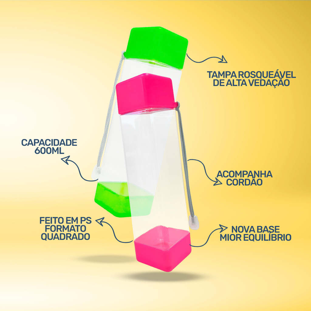 KIT COM 12 PEÇAS A Garrafa Square 600ml combina design moderno e funcionalidade para acompanhar sua rotina com praticidade. Com um formato ergonômico e compacto, é ideal para transportar água, sucos e outras bebidas com segurança. Produzida em material resistente e de alta qualidade, garante durabilidade e um visual sofisticado para o dia a dia. Aplicação: Perfeita para uso no dia a dia, seja no trabalho, academia, escola ou viagens. Ideal para manter a hidratação em atividades esportivas e ao ar livre. Excelente para quem busca praticidade ao transportar bebidas de forma segura. Benefícios: Capacidade de 600ml: Tamanho ideal para manter a hidratação diária. Material resistente: Durável, seguro e fácil de limpar. Design ergonômico e moderno: Fácil de segurar e transportar. Tampa prática: Evita vazamentos e garante a vedação da bebida. Versatilidade: Ideal para água, sucos, chás e outras bebidas. A Garrafa Square 600ml é a escolha perfeita para quem busca um item estiloso, prático e funcional para o dia a dia!
