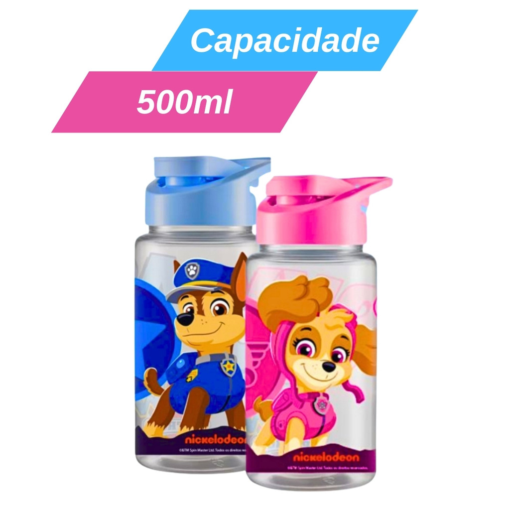 Garrafa de Água Infantil Squeeze Com Tampa Alça Patrulha Canina Menino Menina 500ml