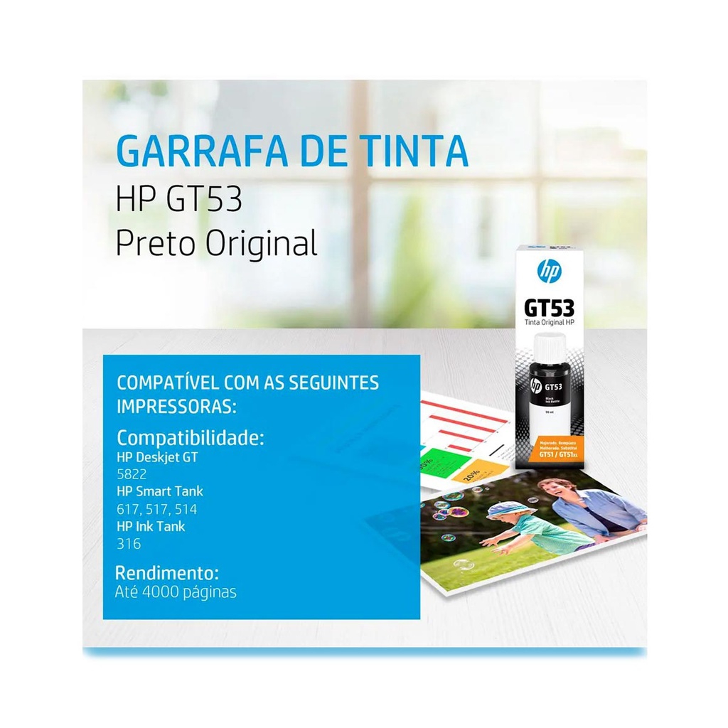 Garrafa de Tinta HP GT53 Preto Os frascos de tinta HP de alto rendimento possibilitam imprimir milhares de páginas com muita eficiência e menos interrupção. A Garrafa de Tinta HP GT53 Preto garante qualidade e confiabilidade de impressão, sendo perfeita para imprimir documentos com texto preto nítido, que permanecem legíveis por muitos anos. Indicada para uso em impressoras da série de tanque de tinta HP. Vantagens da Garrada de Tinta HP GT53 Preto - Rendimento ~4.000 páginas; - Compatibilidade: HP DeskJet GT 5800 series, HP Ink Tank 100, 300, 400 series, HP Smart Tank 500, 600 series - Desempenho e eficiência: reduza reimpressões, economizando papel, tinta e energia; - Tinta sem cheiro à base se água. Especificações Sku: 1VV22AL Rendimento: 4000 Rendimento Por Página (Preto E Branco): ~4.000 páginas Volume Do Cartucho De Impressão: 90 ml Cor (Es) Dos Suprimentos De Impressão: Preto Tipos De Tinta: Com pigmentos Tempo De Armazenagem: 18 meses Dimensões Mínimas (L X P X A): 47 x 47 x 150 mm Dimensões Com Embalagem: 47 x 47 x 150 mm Gama De Temperaturas De Funcionamento: 15 a 35 °C Umidade De Armazenamento: 20 a 80% UR Intervalo De Umidade Para Funcionamento: 20 a 80% UR Amplitude Térmica De Armazenamento: 15 a 35 °C Conteúdo Da Caixa: 1 frasco de tinta Compatibilidade De Hardware: HP DeskJet GT série 5800, HP Ink Tank séries 100, 300, 400, HP Smart Tank série 400, 500, 600, 700, 6000, 7000 Peso: ~0,12 kg Tecnologia De Impressão: HP Thermal Inkjet