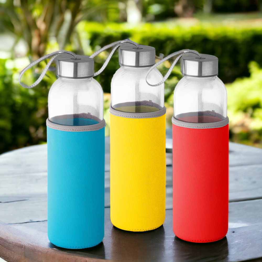 Garrafa de Vidro Squeeze com luva em neoprene soft shell 520ml