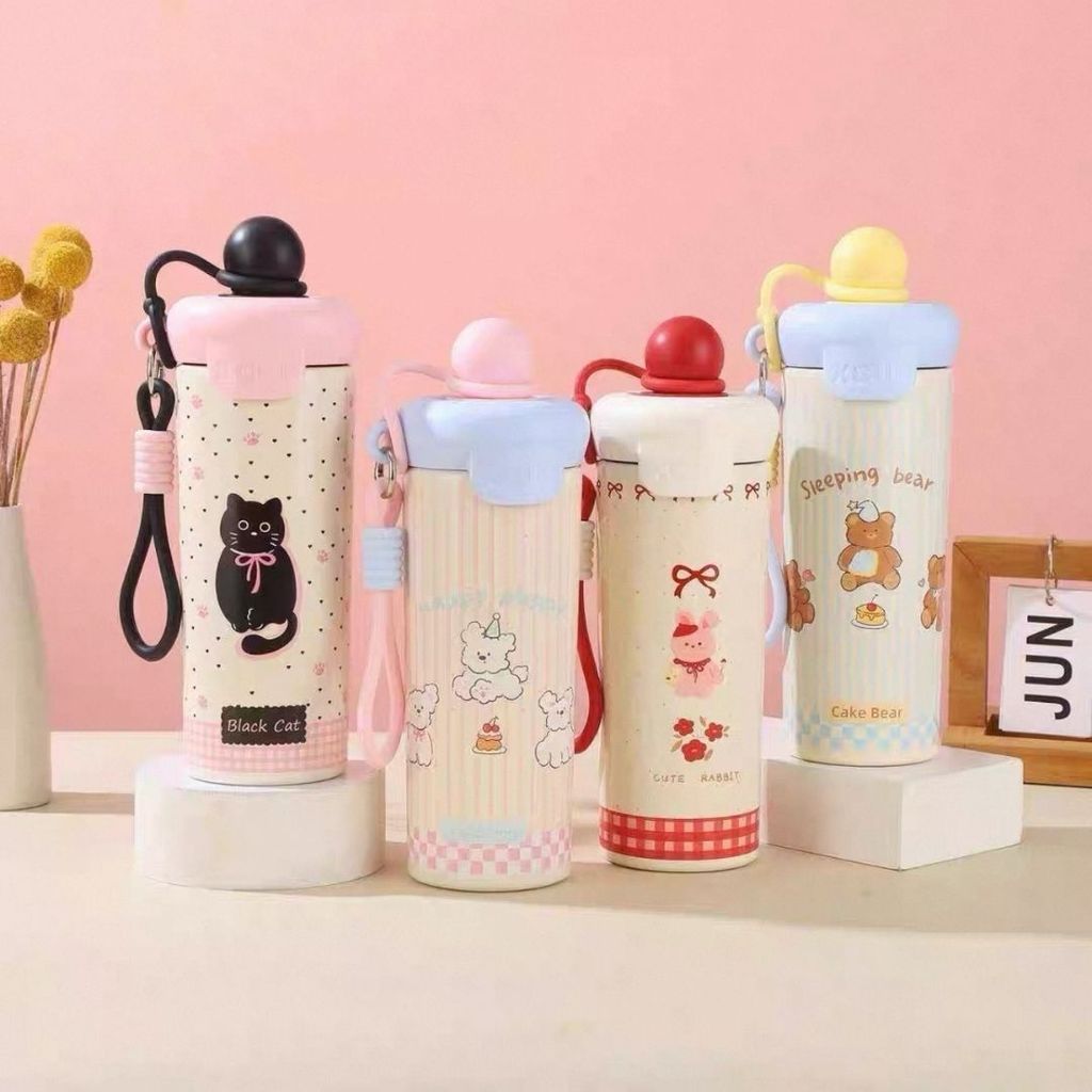 Garrafa Inox Cup 500ml com Estampas Fofas, Dupla Camada Térmica, Canudo, Tampa Antivazamento e Abridor