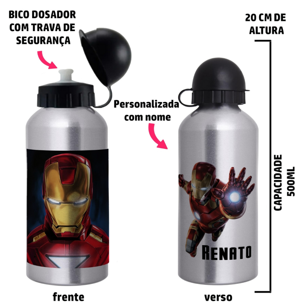 Garrafa Squeeze de alumínio Homem de Ferro - Personalizada com nome