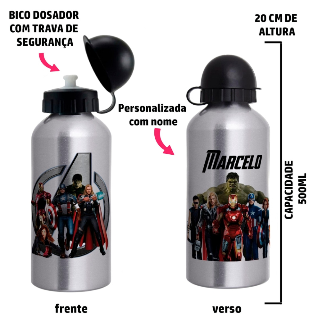 Garrafa Squeeze de alumínio infantil - Vingadores com nome