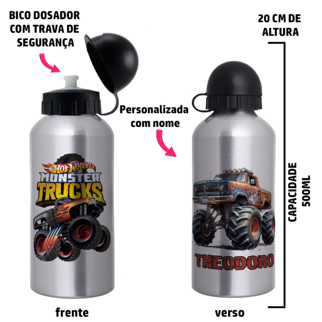Garrafa Squeeze Infantil de alumínio com 500ml - Personalizada com nome - Monster Truck