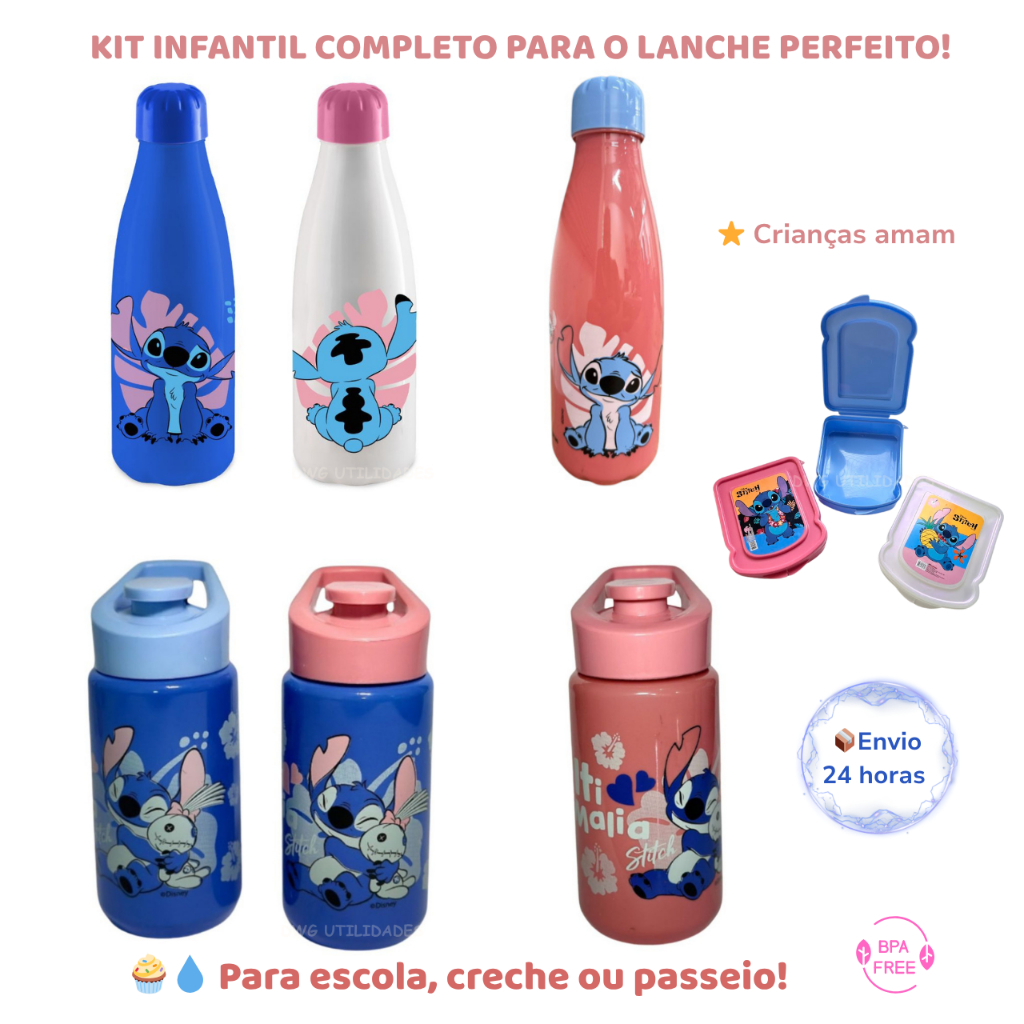 Kit Garrafa Infantil Stitch | Squeeze Escolar Lancheira Menino e Menina Disney Leve charme, praticidade e segurança para o dia a dia dos pequenos com este Kit Infantil Stitch. Composto por: Garrafa/Squeeze de 600 ml com tampa rosqueável ou de 500 ml com tampa abre e fecha livre de BPA, feita em plástico PET resistente — perfeita para manter bebidas sempre à mão durante a escola, creche ou passeios Com estampas fofas do Stitch da Disney, o kit encanta as crianças e estimula bons hábitos alimentares. Perfeito para incluir na mochila, carro ou bolsa, com envelope leve e durável. Lancheira/sanduicheira compacta, ideal para lanches leves como frutas, biscoitos ou sanduíches — fácil de abrir e com fechamento seguro ✨ Vantagens Versatilidade: pode ser usado por meninas e meninos, em diversas situações. Ideal para brindes: ótimo para lembrancinhas em festas temáticas ⭐ Benefícios BPA Free – saúde e segurança para toda família Alta capacidade (600 ml) – hidratação suficiente para um dia inteiro Alta capacidade (500 ML) – hidratação suficiente para um dia inteiro Tampa anti-vazamento – ideal para mochilas sem preocupações. Leveza e praticidade – materiais resistentes, fáceis de limpar e transportar. Personagens cativantes e cores vibrantes que encantam crianças e pais. 📌 Especificações técnicas Capacidade 600 ml (garrafa squeeze)ou 500 ml conforme escolha Material PET plástico, livre de BPA Dimensões Aproximadamente 22,5 cm (altura) × 7 cm (diâmetro) Estampas Stitch – variedade de cores (azul, rosa, branco etc.) Inclui 1 garrafa + 1 lancheira/sanduicheira ( conforme escolha) Uso recomendado: Escola, creche, piquenique, academia infantil Envio:Pronta entrega (24h)* #Garrafa Stitch #garrafainfantil #stitich #escola #passeio