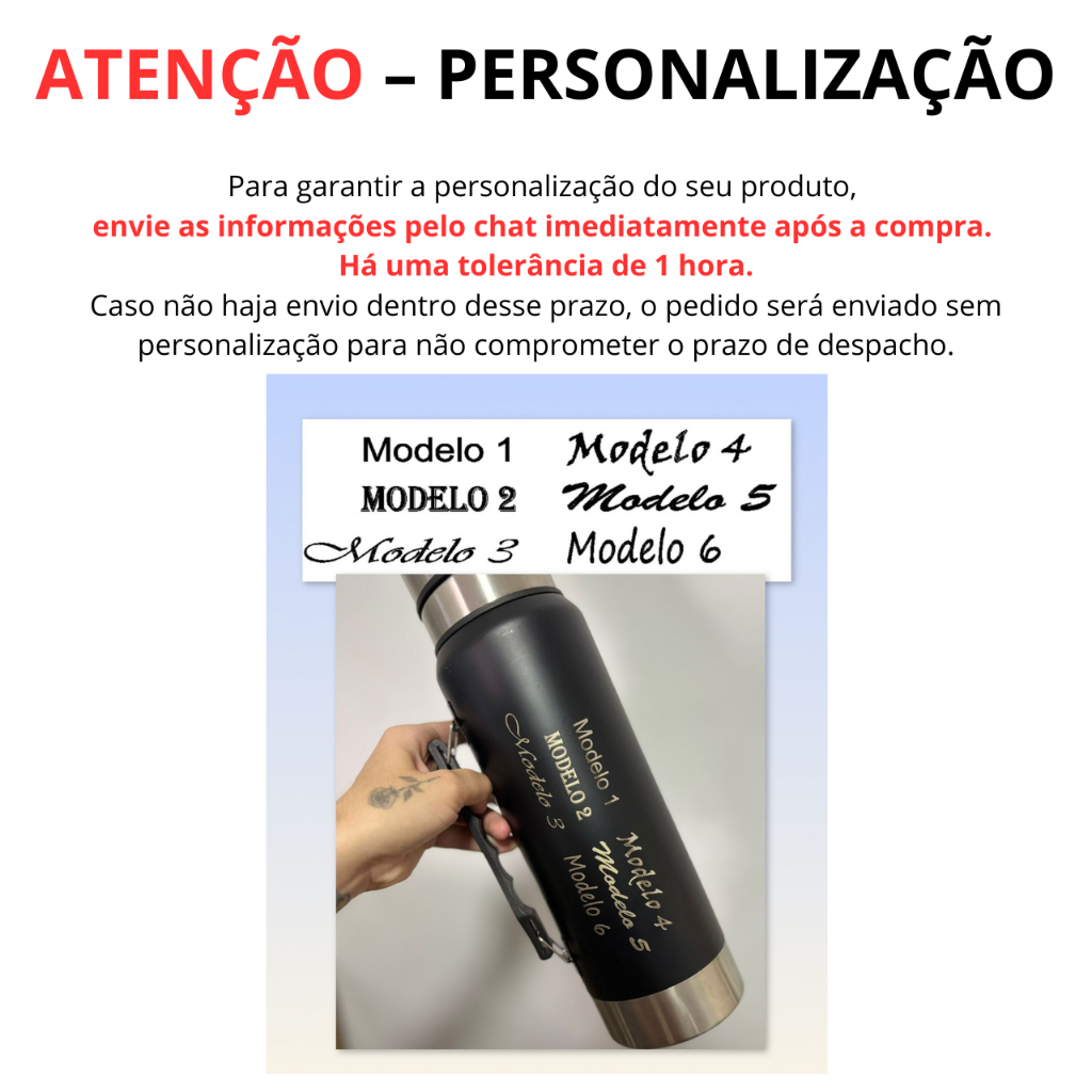 ATENÇÃO – PERSONALIZAÇÃO Para garantir a personalização do seu produto, envie as informações pelo chat imediatamente após a compra. Há uma tolerância de 1 hora. Caso não haja envio dentro desse prazo, o pedido será enviado sem personalização para não comprometer o prazo de despacho. Observações importantes: • Não realizamos gravação colorida. • A gravação a laser fica na cor prata. 🧊 Garrafa Térmica Inox 1,5 Litros – Parede Dupla & Alta Performance Descrição: A Garrafa Térmica de 1,5L é feita em inox 304 de parede dupla, perfeita para manter sua bebida quente ou gelada por horas 🔥❄️. Conta com alça para transporte, tampa rosqueável de proteção para o bocal e design robusto para o dia a dia. Ideal para treinos, trabalho, viagens e aventuras! 💼🏕️ 📏 Medidas Altura: 33,5 cm Largura: 9,7 cm Circunferência: 30,5 cm ⚙️ Informações Técnicas Material: Inox 304 de alta durabilidade Peso aproximado: 585 g Capacidade: 1,5 Litros Tampa com alça + tampa rosqueável de proteção 🧳
