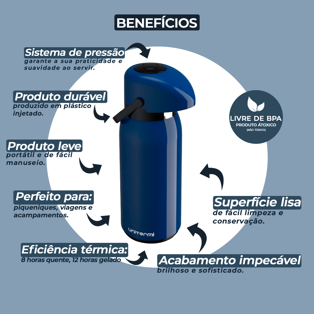 A Garrafa Térmica Unitermi Verona une praticidade, elegância e desempenho térmico para te acompanhar no dia a dia ou em momentos especiais. Ideal para café ☕, chá, tererê 🧉, suco 🧃 ou água 💧, ela mantém suas bebidas na temperatura certa por horas! ✅ Destaques do Produto: Sistema de bomba de pressão suave para servir com praticidade 🔄 Ampola de vidro, que conserva melhor a temperatura Design moderno e acabamento brilhoso ✨ Alça resistente para transporte seguro 💪 Bico antigotas, evita desperdícios 💦 Ideal para uso em casa, no trabalho, em viagens ou ao ar livre 🏕️🏖️🎒 📐 Especificações Técnicas: Capacidade: 1,8 Litros ou 1 Litro Peso: 0,765 Kg (1,8 Litros) - 0,560 kg (1 Litro) Dimensões: 1.8 Litros: 13,5 cm (Largura) x 15 cm (Profundidade) x 36,2 cm (Altura) 1 Litro: 11 cm (Largura) x 14 cm (Profundidade) x 30,5 cm (Altura) 600ml : 11 cm (Largura) x 14 cm (Profundidade) x 25 cm (Altura) Material: Ampola de vidro e corpo em plástico injetado Eficiência Térmica: 🔥 Quente por até 8 horas ❄️ Frio por até 12 horas Norma Técnica: ABNT – NBR 13282 🧼 Cuidados e Dicas: Evite quedas — o produto possui ampola de vidro frágil Para bebidas geladas, resfrie com água fria antes de usar (⛔ Não usar gelo) Nunca remova a borracha de vedação – apenas higienize com água e sabão neutro Antes do primeiro uso, escalde com água quente por 2 horas para melhor desempenho 💯 Produto novo | Original Unitermi | Envio rápido com nota fiscal 🧾 | Pronto para uso ou presente 🎁