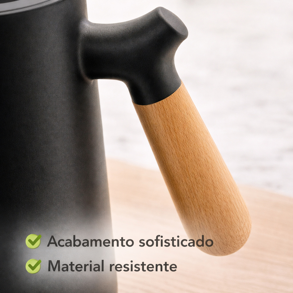 Garrafa Térmica 1L Nórdica Preta Cabo Madeira Café Chá Quente Frio Premium Elegante