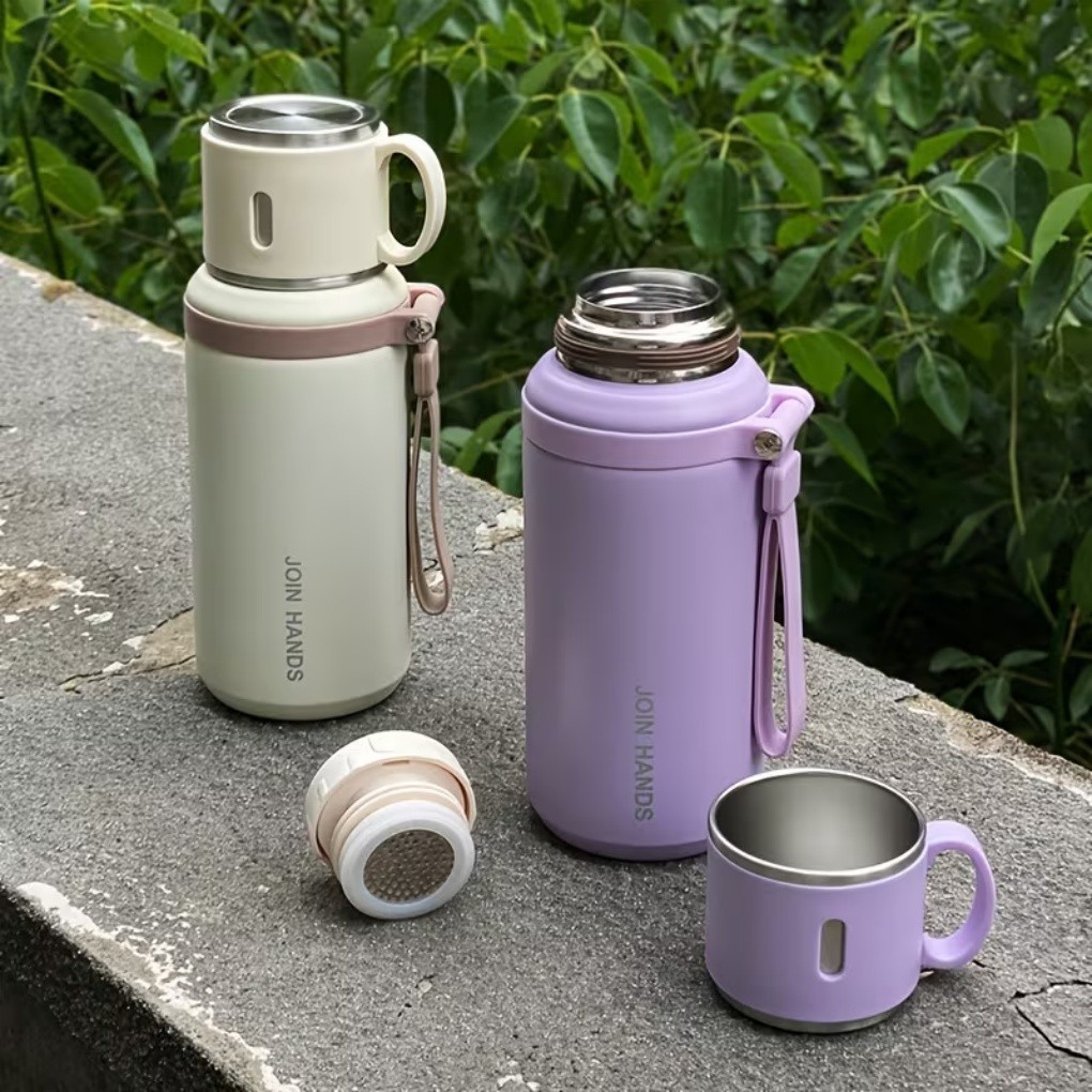 Garrafa Térmica 600ML de Aço Inoxidável com Copo Integrado, Infusor de Chá e Alça Portátil para Bebidas Quentes e Frias