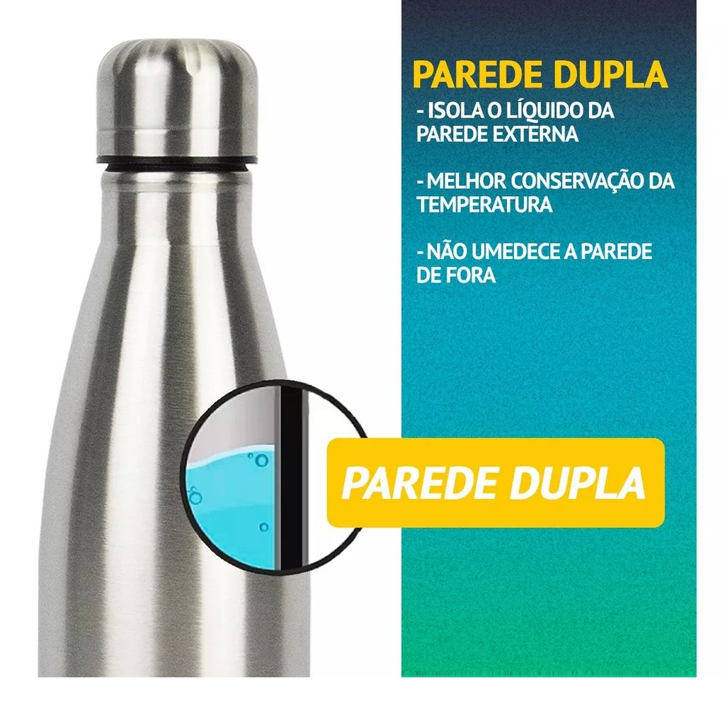 GARRAFA SQUEEZE TÉRMICA DE ÁGUA AÇO INOX 1 LITRO PAREDE DUPLA.IDEAL PARA ACADEMIA, TRILHA, CAMPING, VIAGEM, ACAMPAMENTO DENTRE OUTRAS DIVERSAS SITUAÇÕES PARA BEBER ÁGUA GELADA PARA REFRESCAR E MANTER A SAÚDE.MANTENHA SUA BEBIDA FRESCA COM A GARRAFA DE ÁGUA INOX 1 LITRO Deguste suas bebidas favoritas sem ter o risco de beber algo com "GOSTO OU CHEIRO DE PLÁSTICO" Construção em INOX e com PAREDE DUPLA ajudando a evitar que sabores e cheiros permaneçam na garrafa mesmo após a sua lavagem. Você poderá ter a PRATICIDADE E PORTABILIDADE de levar a sua bebida favorita para qualquer lugar. Seu DESIGN permite e garante que suas bebidas durem MAIS TEMPO DO QUE GARRAFAS COMUNS E CONVÊNCIONAIS DE PLÁSTICO CARATERÍSTICAS - Tampa rosca hermética. - Resistente a corrosão - Parede Dupla- Isolamento térmico À Vacuo - Portátil - Conserva até aproximadamente 12 horas com BEDIDAS QUENTES - Conserva até aproximadamente 24 horas com BEBIDAS FRIAS ESPECIFICAÇÕES - Material: Aço Inox - Capacidade: 1 Litro - Dimensões: 32,2 x 8,9 x 8,9 - Tamanho do bocal: 4 cm - Peso: Aproximadamente 506 gramas DICAS DE USO - Lave a garrafa com detergente neutro e esponja macia. - NÃO USE esponjas de aço ou a parte verde de esponjas para a lavagem, pois tais produtos podem riscar ou danificar a garrafa. - Seque após a lavagem com um pano macio. - Cuidado com a utilização de bebidas quentes, pois a garrafa se iguala a temperatura do líquido, então tome cuidado VALIDAR - Recomendamos EVITAR deixar o produto exposto ao sol. PERGUNTAS FREQUENTES PERGUNTA: A Garrafa transfere a temperatura ? RESPOSTA: Esse modelo não transfere. PERGUNTA: A garrafa pode ser personalizada ? RESPOSTA: Não recomendamos a personalização do produto Itens Inclusos - 1x Garrafa de Água Inox 1 Litro Aviso legal• Livre de BPA.