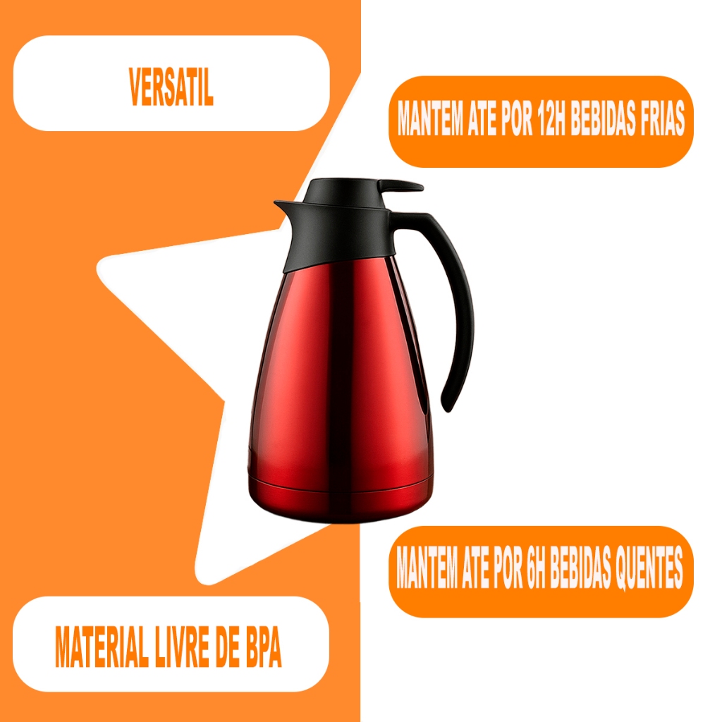SEJA BEM-VINDO A ESTRELA DO LAR! Bule Térmico Acolher Inox 1L Sanremo Bule Térmico Acolher Inox 1L Sanremo - Conserve bebidas quentes por horas com design moderno O Bule Térmico Inox Sanremo 1L é a escolha ideal para quem busca manter suas bebidas na temperatura ideal por muito mais tempo, sem abrir mão da elegância e durabilidade. Fabricado com estrutura 100% em aço inox, este bule combina resistência com um design sofisticado, perfeito para uso doméstico, escritórios ou recepções; Com capacidade de 1 litro, ele é ideal para servir café, chá, leite ou água quente em diferentes momentos do dia. O isolamento térmico eficiente mantém as bebidas quentes ou frias por horas, proporcionando mais conforto e praticidade na sua rotina; Um dos grandes diferenciais do bule térmico Sanremo é o seu acabamento colorido com brilho, que une estilo à funcionalidade, combinando facilmente com qualquer decoração de cozinha ou ambiente profissional. Além disso, sua tampa conta com sistema de abertura prática e vedação eficiente, garantindo segurança no uso e evitando vazamentos; Com formato ergonômico e bico direcionador, o manuseio é fácil e confortável, tornando o ato de servir muito mais prático. O bule é fabricado com materiais livres de BPA, o que assegura mais saúde para toda a família; Este produto é perfeito para quem deseja aliar qualidade, estilo e eficiência térmica em um único item. Seja em casa, no escritório ou em eventos, o bule térmico Sanremo oferece um excelente desempenho com a confiabilidade de uma marca reconhecida; Principais vantagens: Estrutura 100% em inox: durável e resistente; Capacidade de 1L: ideal para uso diário; Mantém a temperatura por horas; Design colorido e moderno; Tampa prática com vedação segura; Produto atóxico e livre de BPA. Garanta agora seu bule térmico de inox Sanremo e leve mais funcionalidade e sofisticação para o seu dia a dia! ESTRELA DOLAR AQUI TEM TUDO QIE SEU LAR MERECE!