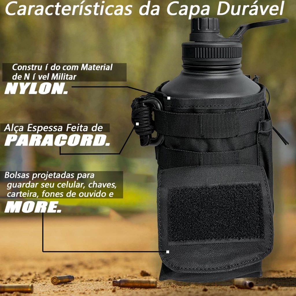 Seja em uma missão ou em uma aventura, manter-se adequadamente hidratado é crucial. A garrafa térmica de 1,9L com sua capa companheira combina perfeitamente design e funcionalidade, oferecendo durabilidade incomparável e praticidade máxima para ajudá-lo a entrar no ritmo mais rapidamente. Uma Experiência de Hidratação Pura e Perfeita Construída com uma estrutura confiável de aço inoxidável de dupla parede, a garrafa de 1,9L mantém as bebidas frias ou quentes por mais de 24 horas. Com sua grande capacidade de 64 oz (onças), esta garrafa térmica requer apenas 1 ou 2 recargas para atender sem esforço às suas necessidades diárias de hidratação, adicionando conveniência às suas aventuras. Tudo em Uma Bolsa, Controle Total na Mão A bolsa de transporte incluída é especificamente projetada para garrafas de água táticas. O suporte da garrafa equilibra durabilidade e funcionalidade, fornecendo uma solução conveniente para transportar sua garrafa de água durante atividades exigentes. Bolsos laterais armazenam com organização itens essenciais do dia a dia, eliminando a necessidade de revirar a mochila e dizendo adeus a bolsas de armazenamento extras. Altere as configurações instantaneamente para sessões de academia, acampamentos ou modo de carregamento urbano diário. Especificações Capacidade: 1,9L Cores: Preto, Verde, Caqui Circunferência da abertura: 6cm Material: Aço Inoxidável 304 Instruções de Cuidados:Dishwasher segura, porém recomendamos lavagem à mão com solução não-abrasiva para a vida prolongada. Notas: 1-adevido à diferença de configuração de luz e tela, a cor do item pode ser ligeiramente diferente das fotos. 2.por favor, permitir uma leve dimensão diferença devido a diferentes medição manual. Livre de BPA.