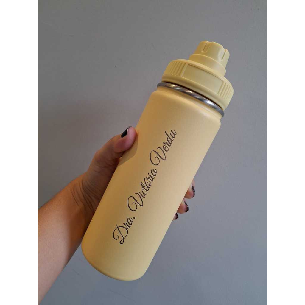 **ENVIAR O NOME E FONTE EM 1 HORA ⏰** Caso ao contrário será enviado sem personalização ou com a fonte padrão. Garrafa térmica em aço inox com parede dupla com capacidade de até 570 ml. Tampa rosqueável, alça em plástico e anel de silicone para vedação. Design com frisos na tampa e pintura pó. Dimensão Produto: 23xø7,3cm *As cores Azul Escuro e Laranja possuem pintura a pó e corpo externo mais brilhoso em comparação com as outras cores.*