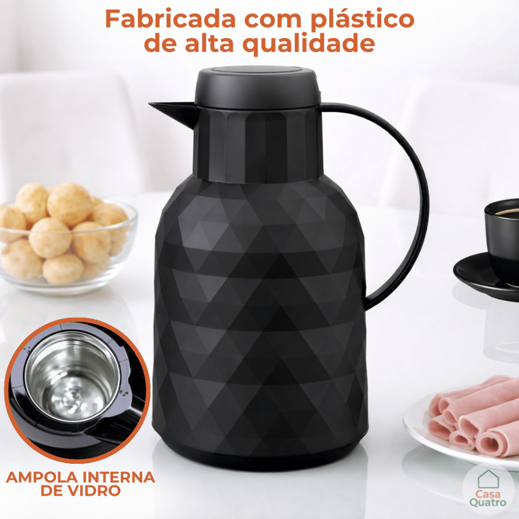 Garrafa Térmica Design Diamante Sistema Click 1 Litro A Garrafa Térmica Premium com Ampola de Vidro foi criada para quem valoriza praticidade, elegância e eficiência térmica no dia a dia. Com design sofisticado inspirado em diamantes e tecnologia de isolamento de alto desempenho, ela mantém suas bebidas na temperatura ideal por muito mais tempo, seja em casa, no trabalho ou em momentos especiais. Um item funcional que também valoriza a decoração da sua mesa. ________________________________________ Benefícios • Mantém bebidas quentes por até 12 horas • Conserva bebidas frias por até 24 horas • Sistema de abertura Click, prático e seguro, com apenas um toque • Não vaza e evita desperdícios durante o uso • Preserva sabor e aroma das bebidas • Ideal para café, chá, água, sucos ou bebidas geladas • Design elegante que combina com qualquer ambiente ________________________________________ Características • Fabricada em plástico de alta qualidade, resistente e durável • Ampola interna de vidro, garantindo melhor conservação térmica • Tampa de rosca segura e fácil de manusear • Sistema Click: aperte para abrir e fechar • Alça ergonômica para servir com mais controle • Acabamento sofisticado com textura inspirada em diamantes Produto pensado para uso diário, sem complicações. ________________________________________ Dimensões • Altura: 24 cm • Largura: 18,5 cm ________________________________________ Se você busca uma garrafa térmica que realmente mantém a temperatura, com design moderno e uso simples, essa é a escolha certa. Um produto durável, funcional e elegante que faz diferença na rotina.