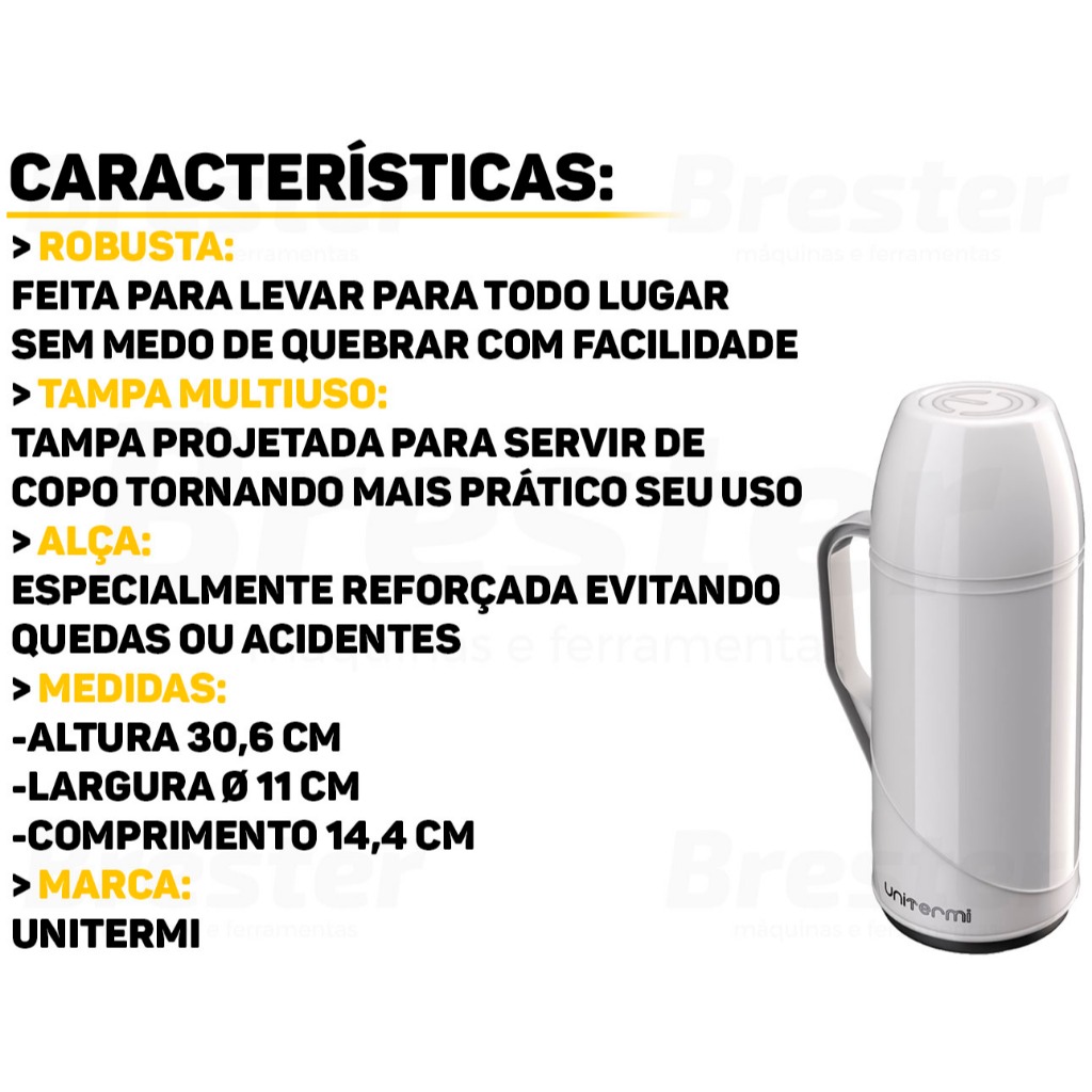 Olá, Bem vindo a Distribuidora Brester. Trabalhamos com uma grande variedade de ferramentas elétricas e manuais, descartáveis, eletroeletrônicos, artigos para casa, artigos de petshop e outros. Aqui você encontrará Produtos Originais, Nota Fiscal, Pronta Entrega e Envio Imediato! * Características do produto * Garrafa Térmica De Mesa Roma Tradição 1 Litro C/ Bico Dosador Preservando as qualidades da linha Roma, a linha tradição busca facilitar ainda mais o cotidiano, com sua tampa de dupla função. Alem da função tampa rolha, ela dispõe de bico dosador, simplicidade e praticidade no dia-a-dia. Descrição Técnica: > Capacidade: 1,0L > Peso do produto: 0,545 Kg > Dimensões(CxLxA): 110 x 144 x 306 mm > Material: Ampola de Vidro e demais peças em plástico injetado. > Norma: ABNT - NBR 13282 Conservação Térmica: > Quente: 8 Horas > Frio: 12 Horas Obs: O TESTE PARA VERIFICAÇÃO DE FUNCIONAMENTO CORRETO DA GARRAFA DEVE SER FEITO SOMENTE COM ÁGUA, PARA NÃO DANIFICAR A INTEGRIDADE DO PRODUTO EM CASO DE NECESSIDADE DE TROCA. NÃO ACEITAREMOS DEVOLUÇÕES APÓS O USO COM CAFÉ. Toda garrafa térmica, independente de marca e modelo, deve ser aquecida com água fervente antes do uso. - Marca: Unitermi - Garantia: 90 dias contra defeitos de fabricação Vantagens de comprar na Brester: - Nota fiscal para Pessoa Física e Pessoa Jurídica. - Produto novo, com garantia de fábrica. - Produto a pronta entrega. - Envio em até 24hs em dias úteis após confirmação do pagamento. Obrigado por escolher a Brester Máquinas.