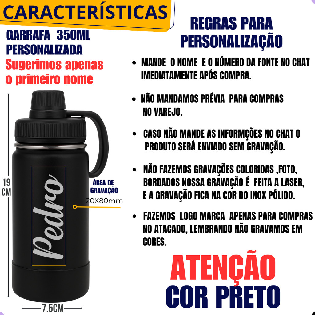 ****************** SEJA BEM VINDO ****************** *** PROMOÇÃO POR TEMPO LIMITADO *** *** POUCAS UNIDADES NO VALOR PROMOCIONAL *** *** VENDEMOS NO ATACADO SOLICITE O LINK PELO CHAT *** *** COMPRANDO ATÉ MEIO DIA, DESPACHAMOS NO MESMO DIA *** *** PARA COMPRAS EM SP ENTREGAMOS VIA FLEX NO MESMO DIA*** 🚀 ENVIO RÁPIDO | ÓTIMA AVALIAÇÃO | PRONTA ENTREGA __________________________________________________ ✅ Atenção leia antes da compra. - Gravação feita a laser, não gravamos em cores (a gravação fica no tom do inox). - Sobre a gravação, nossa gravação é feita a laser, uma gravação permanente não sai por nada mesmo, a gravação fica na cor do inox pólido uma gravação lisa e espelhada. Não gravamos em cores. - Não fazemos imagens coloridas, fotos, imagens de bordados ou imagens de baixa qualidade. - Fazemos logo marcas apenas para compras no atacado, minimo 10 unidades, para compras no varejo fazemos apenas figuras do nosso cátalogo que está nas fotos do anúncio. - Gravação padrão na frente do produto com medidas 20mm x 80mm (nome) e 35mm x 35mm (logo). - Mande no chat de compra o número da fonte e o número da figura imediatamente após a sua compra. Caso não mande seu produto será enviado sem gravação. - Após mandar o número da fonte e número da figura é só aguardar, nossa equipe só entrará em contato em caso de dúvidas, se mandou o número da fonte e número da figura está tudo certo é só aguardar a chegada do seu produto. - Mandar no chat só o que foi solicitado, perguntas como o prazo de chegada do seu pedido são fornecidos pela plataforma antes mesmo do pagamento, cumprimos o prazo da plataforma então seu pedido será produzido e enviado no tempo determinado pela plataforma. - Toda informação enviada no chat para gravação do item é de responsabilidade do cliente, então se atente a escrita correta de nomes pontuações etc. - As fontes e as figuras estão disponíveis nas fotos do anúncio. - Não mandamos prévia para compras no varejo, nossa gravação é padronizada e nas fotos do anúncio está o padrão de gravação, mandamos prévias apenas para compras no atacado. - Como temos um prazo curto para enviarmos o produto não temos tempo para enviar prévias. - As informações sobre a gravação estão nas fotos do anúncio. __________________________________________________ ✅ GARRAFA TÉRMICA 350ML + BASE DE SILICONE - PERSONALIZAÇÃO EXCLUSIVA. Mantenha suas bebidas na temperatura ideal durante todo o dia com a Garrafa Térmica linha premium com capacidade de 350ml. Projetada para oferecer praticidade e durabilidade, esta garrafa é perfeita para quem está sempre em movimento, seja no trabalho, na academia, em viagens ou em atividades ao ar livre. ✅ Características Principais: Material Premium: Fabricada em aço inoxidável 304 de alta qualidade, esta garrafa térmica é resistente à corrosão, durável e segura para uso diário. O material inoxidável garante que suas bebidas mantenhamo sabor original, sem alteração. Isolamento Térmico Eficiente: Com tecnologia de isolamento a vácuo de parede dupla, a garrafa mantém suas bebidas frias por horas, proporcionando conforto e conveniência onde quer que você esteja. Capacidade Ideal: Com 350ml, oferece o volume perfeito para manter você hidratado durante o dia, sem a necessidade de recargas constantes. -------------------------------------------------------------------- ✅ CARACTERÍSTICAS DO PRODUTO: - Material: Parede Dupla de Aço Inoxidável. - Revestimento: Pintura Eletrostática - Capacidade: 350ml - Dimensões: Altura: 19cm / Diâmetro: 7 ,7 cm - Livre de BPA - Garantia: Indeterminada - Cor: Verificar a cor Disponível antes da compra. -------------------------------------------------------------------- ✅ ITENS INCLUSOS: - 01 GARRAFA TÉRMICA 350ml+ BASE DE SILICONE + PERSONALIZAÇÃO