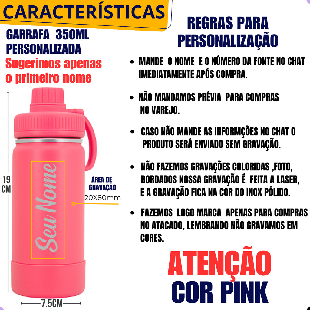 ****************** SEJA BEM VINDO ****************** *** PROMOÇÃO POR TEMPO LIMITADO *** *** POUCAS UNIDADES NO VALOR PROMOCIONAL *** *** VENDEMOS NO ATACADO SOLICITE O LINK PELO CHAT *** *** COMPRANDO ATÉ MEIO DIA, DESPACHAMOS NO MESMO DIA *** *** PARA COMPRAS EM SP ENTREGAMOS VIA FLEX NO MESMO DIA*** 🚀 ENVIO RÁPIDO | ÓTIMA AVALIAÇÃO | PRONTA ENTREGA __________________________________________________ ✅ Atenção leia antes da compra. - Gravação feita a laser, não gravamos em cores (a gravação fica no tom do inox). - Sobre a gravação, nossa gravação é feita a laser, uma gravação permanente não sai por nada mesmo, a gravação fica na cor do inox pólido uma gravação lisa e espelhada. Não gravamos em cores. - Não fazemos imagens coloridas, fotos, imagens de bordados ou imagens de baixa qualidade. - Fazemos logo marcas apenas para compras no atacado, minimo 10 unidades, para compras no varejo fazemos apenas figuras do nosso cátalogo que está nas fotos do anúncio. - Gravação padrão na frente do produto com medidas 20mm x 80mm (nome) e 35mm x 35mm (logo). - Mande no chat de compra o número da fonte e o número da figura imediatamente após a sua compra. Caso não mande seu produto será enviado sem gravação. - Após mandar o número da fonte e número da figura é só aguardar, nossa equipe só entrará em contato em caso de dúvidas, se mandou o número da fonte e número da figura está tudo certo é só aguardar a chegada do seu produto. - Mandar no chat só o que foi solicitado, perguntas como o prazo de chegada do seu pedido são fornecidos pela plataforma antes mesmo do pagamento, cumprimos o prazo da plataforma então seu pedido será produzido e enviado no tempo determinado pela plataforma. - Toda informação enviada no chat para gravação do item é de responsabilidade do cliente, então se atente a escrita correta de nomes pontuações etc. - As fontes e as figuras estão disponíveis nas fotos do anúncio. - Não mandamos prévia para compras no varejo, nossa gravação é padronizada e nas fotos do anúncio está o padrão de gravação, mandamos prévias apenas para compras no atacado. - Como temos um prazo curto para enviarmos o produto não temos tempo para enviar prévias. - As informações sobre a gravação estão nas fotos do anúncio. __________________________________________________ ✅ GARRAFA TÉRMICA 350ML + BASE DE SILICONE - PERSONALIZAÇÃO EXCLUSIVA. Mantenha suas bebidas na temperatura ideal durante todo o dia com a Garrafa Térmica linha premium com capacidade de 350ml. Projetada para oferecer praticidade e durabilidade, esta garrafa é perfeita para quem está sempre em movimento, seja no trabalho, na academia, em viagens ou em atividades ao ar livre. ✅ Características Principais: Material Premium: Fabricada em aço inoxidável 304 de alta qualidade, esta garrafa térmica é resistente à corrosão, durável e segura para uso diário. O material inoxidável garante que suas bebidas mantenhamo sabor original, sem alteração. Isolamento Térmico Eficiente: Com tecnologia de isolamento a vácuo de parede dupla, a garrafa mantém suas bebidas frias por horas, proporcionando conforto e conveniência onde quer que você esteja. Capacidade Ideal: Com 350ml, oferece o volume perfeito para manter você hidratado durante o dia, sem a necessidade de recargas constantes. -------------------------------------------------------------------- ✅ CARACTERÍSTICAS DO PRODUTO: - Material: Parede Dupla de Aço Inoxidável. - Revestimento: Pintura Eletrostática - Capacidade: 350ml - Dimensões: Altura: 19cm / Diâmetro: 7 ,7 cm - Livre de BPA - Garantia: Indeterminada - Cor: Verificar a cor Disponível antes da compra. -------------------------------------------------------------------- ✅ ITENS INCLUSOS: - 01 GARRAFA TÉRMICA 350ml+ BASE DE SILICONE + PERSONALIZAÇÃO