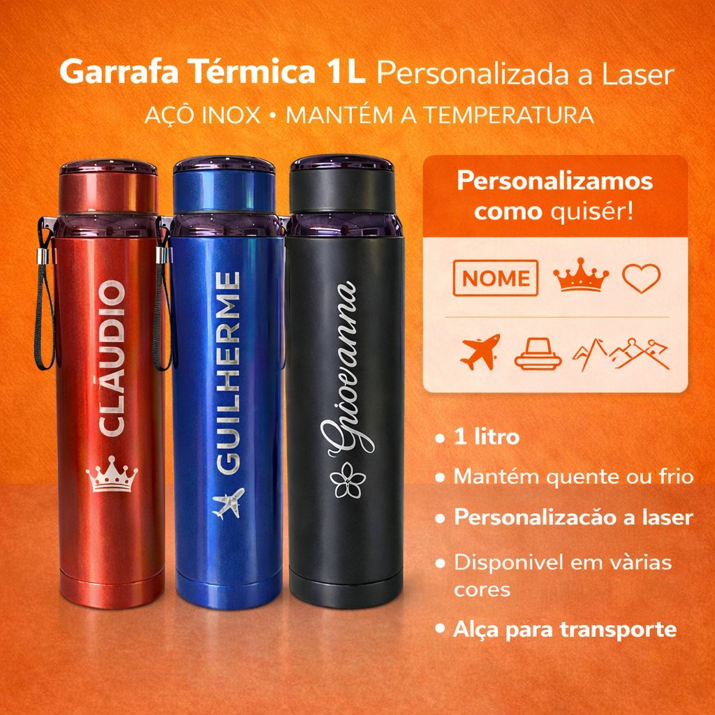 ATENÇÃO: Escolha o tamanho que deseja das garrafas - 600ml ou 1L A GARRAFA PERFEITA PARA O SEU DIA A DIA - AGORA COM O SEU NOME! 💧✨ Você merece uma garrafa que acompanhe seu ritmo. Com capacidade de 600ml, design moderno e personalização definitiva a laser, ela é a união ideal de estilo e hidratação. Chega de garrafas com adesivos que descolam ou tinta que descasca. Nossa gravação é "tatuada" no inox: eterna e sofisticada. 🔥 POR QUE ESTA É A MELHOR GARRAFA DO MERCADO? Tecnologia Laser: Gravamos seu Nome, Time ou Logo retirando a tinta com precisão milimétrica. O resultado é prateado (cor do inox), brilhante e nunca sai na lavagem. Capacidade de 600mL: Tamanho perfeito para não precisar encher toda hora. Ideal para academia, escritório, viagens ou tereré. Eficiência Térmica: Parede dupla com isolamento a vácuo. Mantém sua bebida GELADA ou QUENTE por muito mais tempo. Design Premium: Acabamento fosco de alta qualidade, anel em inox cromado e alça de transporte reforçada. 📋 FICHA TÉCNICA: Material: Aço Inoxidável (não enferruja) Volume: 600ml ou 1L Tipo de Abertura: Tampa de rosca com vedação anti-vazamento. Personalização: Laser (indeléve/permanente). ⚠️ COMO PERSONALIZAR SUA GARRAFA? (MUITO IMPORTANTE) Selecione a COR desejada e finalize a compra. Imediatamente após a compra, nos envie uma mensagem no CHAT com: O NOME a ser gravado. A FONTE (Letra) de sua preferência (temos várias opções!). Caso queira LOGO DE EMPRESA, envie o arquivo em alta qualidade pelo chat. ATENÇÃO: Caso os dados não sejam enviados logo após a compra, o produto poderá ser enviado sem personalização para cumprir o prazo de entrega da plataforma. 🎁 GARANTA JÁ A SUA OU PRESENTEIE QUEM VOCÊ AMA COM EXCLUSIVIDADE!
