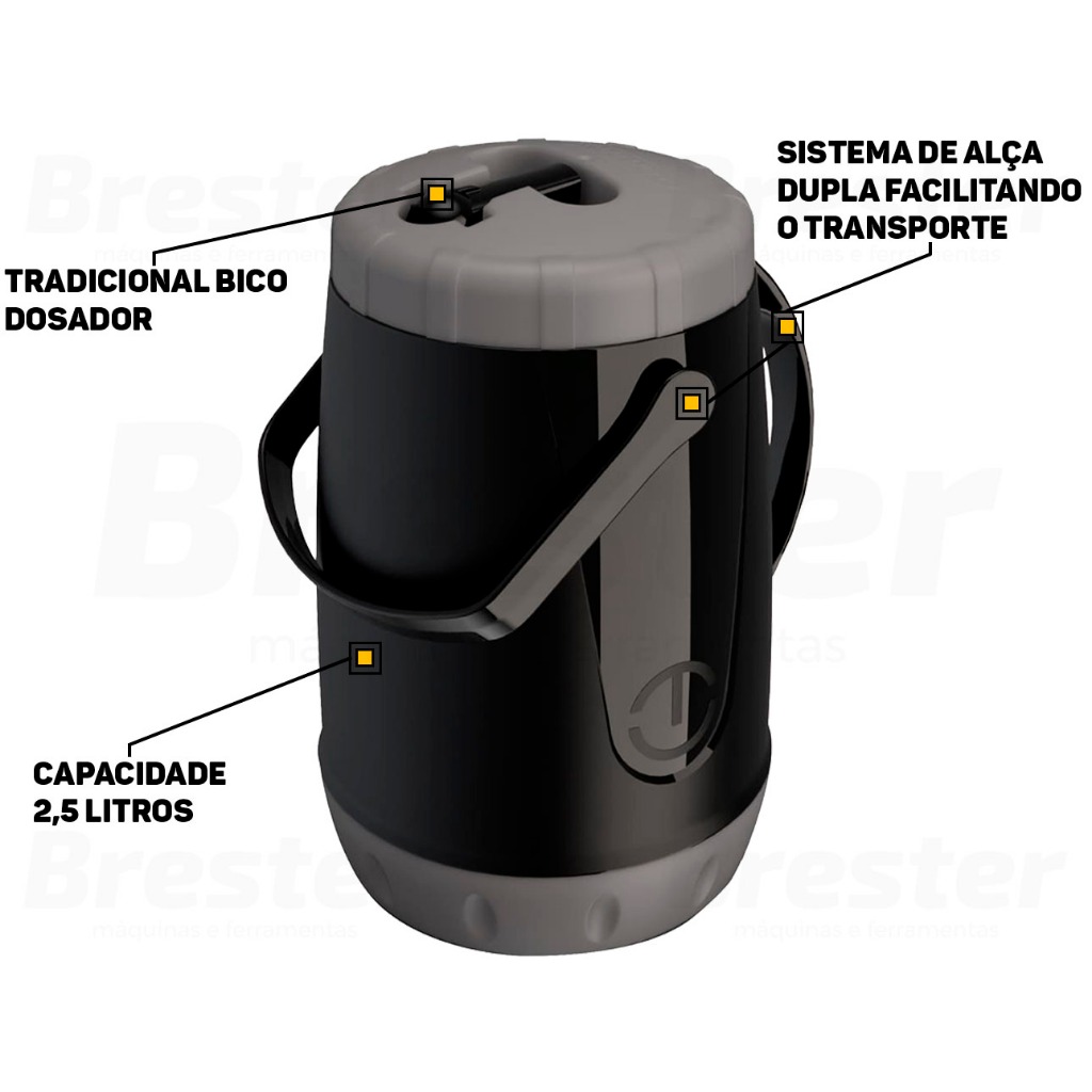 Jarra Garrafa Térmica Pávia 2,5 Litros Unitermi Com capacidade de armazenamento de 2,5L a Jarra Pavia conta com um sistema de alça dupla, garantindo maior facilidade no transporte. Aliado ao tradicional bico dosador, melhorando ainda mais a forma em servir bebidas. Vantagens: > Conserva a temperatura por muito mais tempo. > Tampa de rosca com bico para saída de água. > Possui borracha para vedação na tampa que impossibilita vazamentos. > Alça para servir e alça acoplada para transporte. > Para líquidos frios ou quentes. Descrição Técnica: > Capacidade: 2,5L > Peso do Produto: 0,500 Kg > Dimensões: 167 x 167 x 262 mm > Material: Isolamento em PU (Poliuretano) e demais peças em plástico injetado. > Conservação térmica: Frio: 8 Horas / Quente: 4 Horas Obs: O TESTE PARA VERIFICAÇÃO DE FUNCIONAMENTO CORRETO DA GARRAFA DEVE SER FEITO SOMENTE COM ÁGUA, PARA NÃO DANIFICAR A INTEGRIDADE DO PRODUTO EM CASO DE NECESSIDADE DE TROCA. NÃO ACEITAREMOS DEVOLUÇÕES APÓS O USO COM CAFÉ. Toda garrafa térmica, independente de marca e modelo, deve ser aquecida com água fervente antes do uso. - Marca: Unitermi - Garantia: 90 dias contra defeitos de fabricação Vantagens de comprar na Brester: - Nota fiscal para Pessoa Física e Pessoa Jurídica. - Produto novo, com garantia de fábrica. - Produto a pronta entrega.