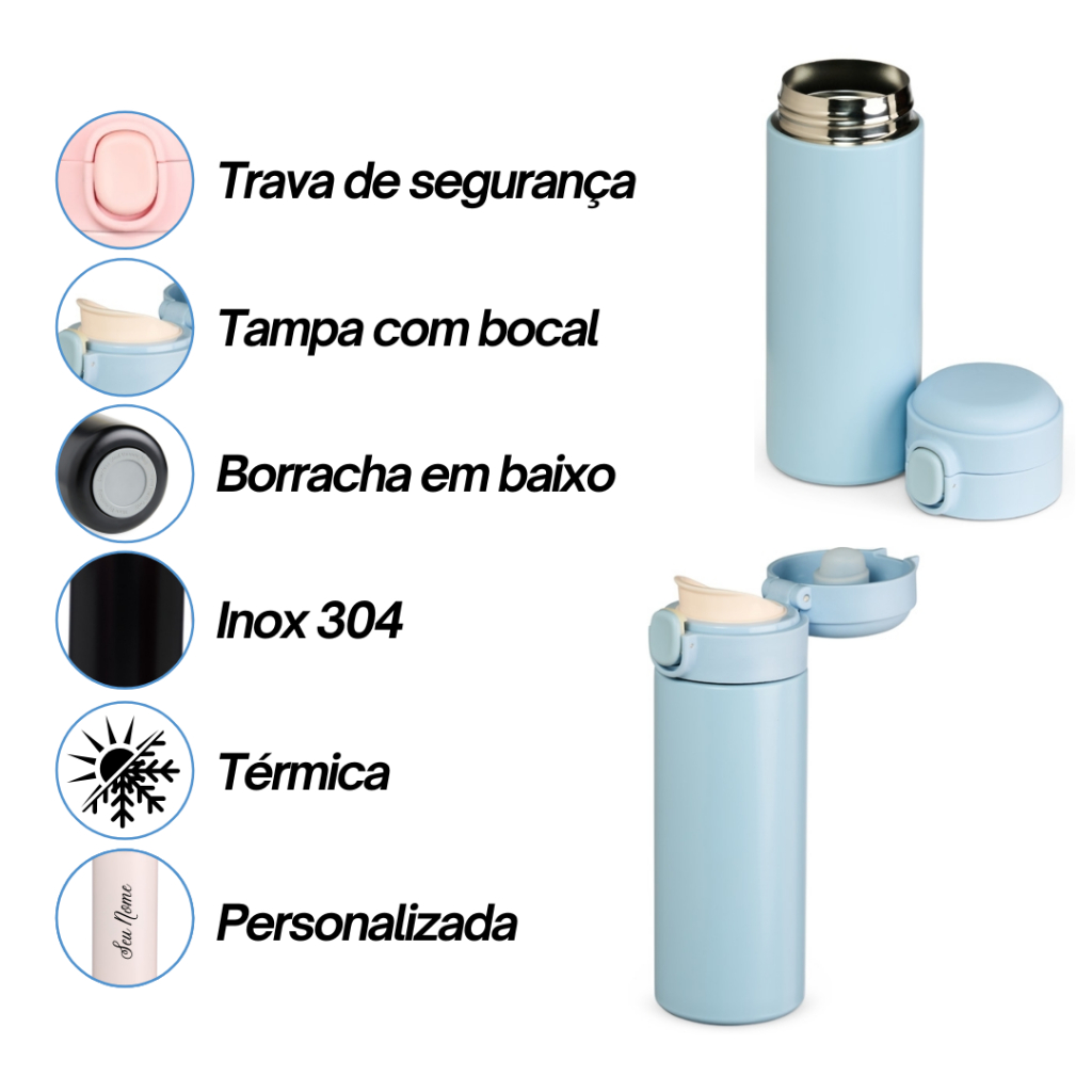 Garrafa térmica Personalizada em inox com parede dupla, capacidade de 400ml. Tampa com botão central para abertura e borracha interna para vedação. ***NÃO TEM VISOR DE LED COM TEMPERATURA NA TAMPA*** ✅ Alta Qualidade e Durabilidade – Fabricada em inox resistente, garantindo longa vida útil. ✅ Conservação Térmica – Parede dupla que mantém a temperatura das bebidas por mais tempo. ✅ Abertura Prática – Tampa com botão central para fácil manuseio. ✅ Vedação Segura – Borracha interna que evita vazamentos. ✅ Proteção Extra – Base emborrachada para evitar arranhões em superfícies. ✅ Personalização Exclusiva – Gravação a laser permanente para um toque sofisticado e único. 🔹 Ideal para brindes corporativos, presentes personalizados e uso no dia a dia! Altura : 20,3 cm Largura : 7,6 cm Circunferência : 20,2 cm Peso aproximado (g): 215 *** NOS ENVIE NO CHAT OU CAMPO DE MENSAGEM O QUE IRÁ PERSONALIZAR*** *** PRAZO DE 5H PARA ENVIO DO QUE IRÁ PERSONALIZAR SE NÃO O PEDIDO SERÁ ENVIADO SEM PERSONALIZAÇÃO***
