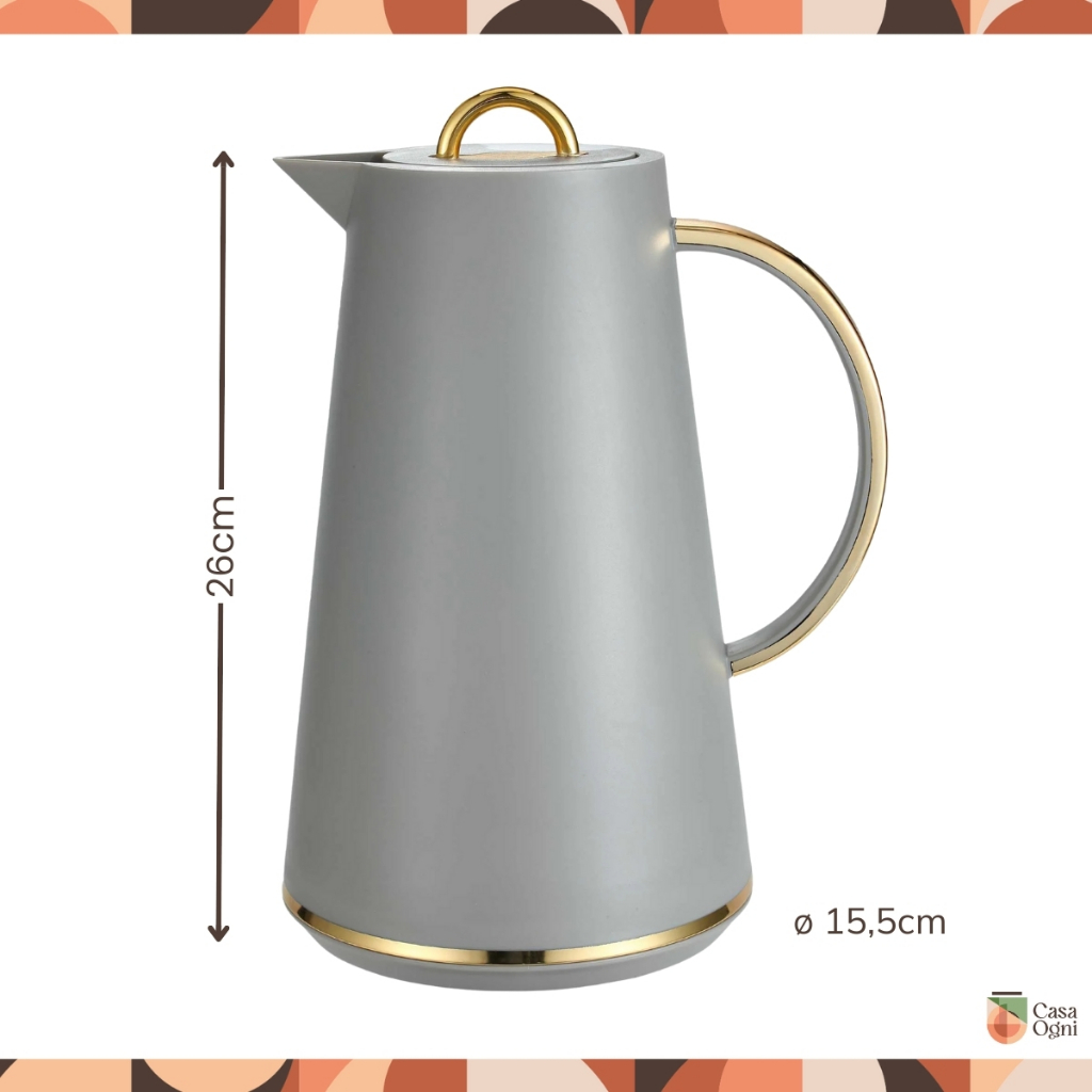 Casa Ogni - A alma da casa está em cada detalhe. A Garrafa Térmica Samira está disponível em três cores neutras e tem capacidade para 1L. Ela possui um botão, que é perfeito para servir com facilidade e seu design clássico com detalhes em dourado a torna ideal para deixar sua mesa posta, ou até mesmo seu dia a dia muito mais sofisticado. Perguntas Frequentes: • Qual é o material da garrafa? Plástico e Vidro. • Quais as medidas? 26 x 15,5cm (Altura x Diâmetro base). • Qual a capacidade? 1 Litro • Tem outro tamanho? Infelizmente não temos. • Quanto tempo a garrafa mantém o café quente? Para líquidos quentes ela conserva a mesma temperatura de 06h à 8h. A partir de 08h o conteúdo se mantém morno por até 18h. Cuidados com o seu produto: • Evite quedas e impactos - pois pode danificar o vidro interno. • Não use produtos abrasivos. • Evites choques térmicos - a mudança brusca de temperatura pode rachar o vidro interno. • Não é recomendado colocar líquidos fervendo. • Não utilize nenhum produto químico na limpeza - limpe apenas com sabão neutro e água morna. • Não coloque a garrafa diretamente embaixo da torneira ou submersa em água. • Seque com pano macio e mantenha a garrafa aberta até secar completamente. • Evite colocar algo muito quente logo depois de algo frio (ou o contrário), pois essa mudança rápida de temperatura pode rachar o vidro. Conteúdo da embalagem: 1 Garrafa Aqui na Casa Ogni a nossa missão é garantir que você, cliente, fique satisfeito tanto com nossos produtos quanto com nosso atendimento. Cuidamos de todos os pequenos detalhes para que sua experiência de compra seja incrível. Compre com segurança, somos representantes autorizados e todos os nossos produtos possuem nota fiscal. Qualquer dúvida nos faça uma pergunta e responderemos o mais rápido possível. Obrigado por escolher a Casa Ogni.