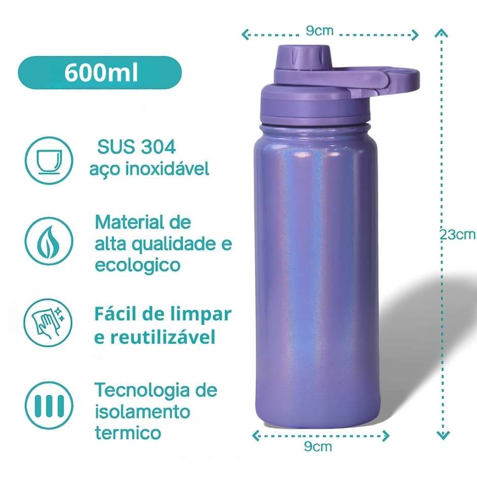 Garrafa Térmica Shine 600ml – 800ml - Personalização Grátis ✨ ✔️ Capacidade: 600ml e 800ml ✔️ Acabamento em glitter, super charmosa ✔️ Mantém a temperatura da bebida por mais tempo ✔️ Personalização grátis com nome, frase ou logo ✔️ Material resistente e de alta qualidade ✔️ Ideal para treinos, trabalho, escola ou presentear 💖 Deixe sua garrafa única com a personalização exclusiva! Cuidados com sua Garrafa: - Não colocar o produto na geladeira ou no congelador, isso pode danificá-lo. - Recomenda-se pré-aquecer ou pré-resfriar a garrafa com água antes de colocar o conteúdo, para mais tempo de conservação. - Não colocar na lava-louças. - Utilize detergente neutro ou bicarbonato de sódio - Utilize escova de cerdas macias - Palha-de-aço (Bombril ou similares) e aço inox, não combinam! Os resíduos da palha-de-aço são agentes contaminantes, eles se impregnam na superfície do inox e fatalmente irão aparecer pontos semelhantes ao de oxidação! No caso das manchas mais difíceis de serem removidas, a dica é deixar a peça de molho alguns minutos com bicarbonato de sódio e água morna, depois esfregar com uma escova de cerdas macias. - A borracha de vedação pode ser removida para lavagem. Lavar apenas com água para evitar ressecamento. - Evite produtos de limpeza à base de cloro (água sanitária e sabão contendo cloro, sapólio), pois o cloro é um forte agente oxidante, podendo causar manchas e dependendo da concentração e tempo de exposição, pode até causar a corrosão, mesmo em aço inox de alta qualidade. - Evitar contato com objetos pontiagudos e ásperos com risco de arranhar a estampa. - Evitar contato com acetona, álcool e líquidos à base de cloro. - Certifique-se de que a tampa está fechada e a borracha bem posicionada antes de carregar o produto, para evitar que o líquido vaze. - Evitar o armazenamento de líquidos gaseificados na garrafa. -Deixar secar sempre aberto, em lugar arejado e na sombra. -É normal que a tampa da garrafa transpire um pouco, pois a mesma não é composta por aço inox. Dimensões e Composição - Capacidade: 800ml(27cm) - Capacidade: 600ml(24cm) - Parede dupla isolada a vácuo; - Corpo em Aço inoxidável 304 (aço inoxidável 18/8); - Frasco livre de BPA.