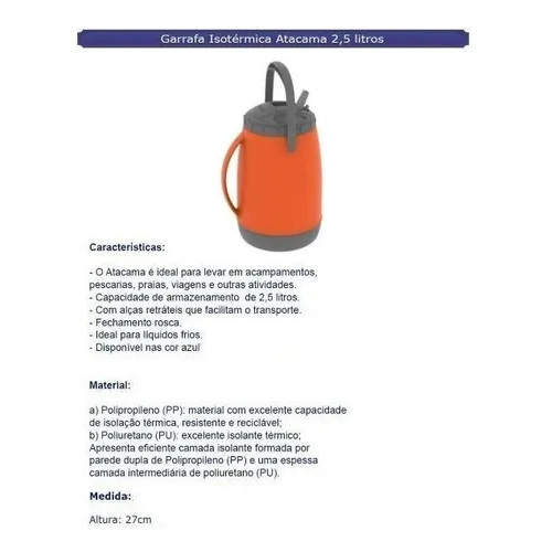 Claro, aqui está a descrição para a versão laranja da garrafa. Garrafa Isotérmica com Bico 2,5 L Laranja Atacama - Soprano Garrafa térmica ideal para manter bebidas geladas em acampamentos, trilhas, pescarias e no dia a dia. Com capacidade de 2,5 litros, ela é perfeita para levar uma grande quantidade de líquido para você e seus acompanhantes. O design funcional inclui uma alça para transporte, bico retrátil e higiênico, além de um bocal largo que facilita a limpeza e a adição de cubos de gelo. Fabricada em polipropileno de alta qualidade e com isolamento térmico em Poliuretano (PU), a garrafa é livre de bisfenol (BPA Free), garantindo segurança total para sua saúde. Ela oferece uma eficiência térmica de até 4 horas para líquidos frios, mantendo sua bebida gelada por mais tempo, onde quer que você esteja.