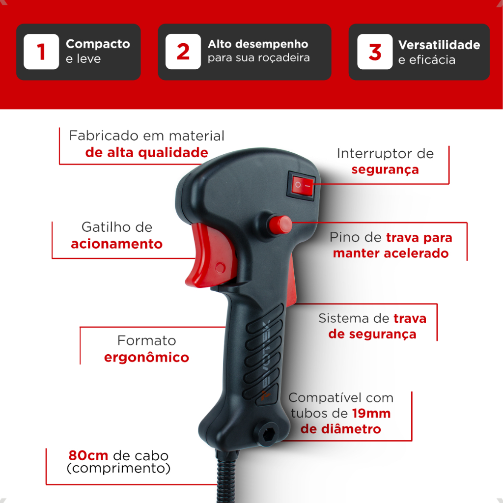 O Gatilho Acelerador Completo Punho Para Roçadeira 43cc 52cc Multimarcas Jardim Corte Grama oferece controle e potência em suas mãos! Com um simples movimento, você pode ajustar a velocidade e a intensidade do corte, proporcionando um desempenho preciso e eficiente Sinta o poder fluir enquanto você domina terrenos desafiadores e mantém sua paisagem impecável! Projetado para facilitar o seu trabalho, o gatilho acelerador é a escolha ideal para os mais exigentes profissionais da jardinagem e da agricultura. Experimente o poder em suas mãos hoje mesmo! Benefícios: ----------------- - Controle Preciso - Eficiência Aumentada - Manuseia Confortável - Adaptação a diferentes superfícies - Segurança Aprimorada - Punho ergonômico - Resistente a impactos Especificações Técnicas: ---------------------------------- - Compatíveis com tubo de 19mm de diâmetro - Cabo de 80cm Comprimento - Chave Liga e Desliga - Pino trava gatilho (Mantém Motor Acelerado) Acompanha: ------------------ 01 Gatilho Acelerador para Roçadeira