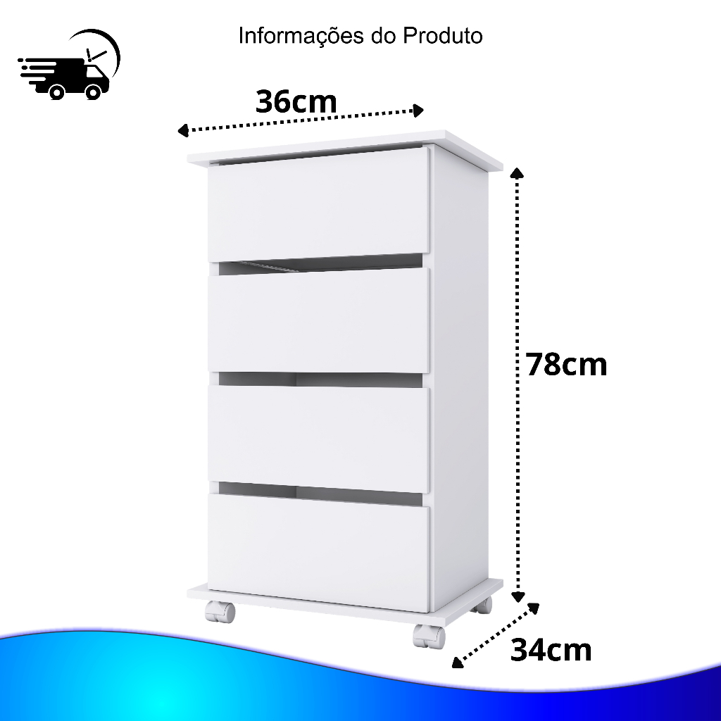 O Gaveteiro Com 4 Gavetas E Rodas Para Sala da marca é a escolha perfeita para quem busca organização e praticidade. Com 4 gavetas espaçosas, você poderá guardar seus pertences de forma eficiente. Feito em MDP/MDF de alta qualidade, este gaveteiro possui um design moderno e elegante que se encaixa perfeitamente em qualquer ambiente. Com 78 cm de comprimento, 36 cm de largura e 34 cm de profundidade, este móvel é ideal para salas de estar, quartos ou escritórios. Além disso, suas rodas facilitam a movimentação, tornando-o ainda mais versátil. Aproveite para adicionar um toque de estilo e organização ao seu espaço com este belo gaveteiro da Maya Place.