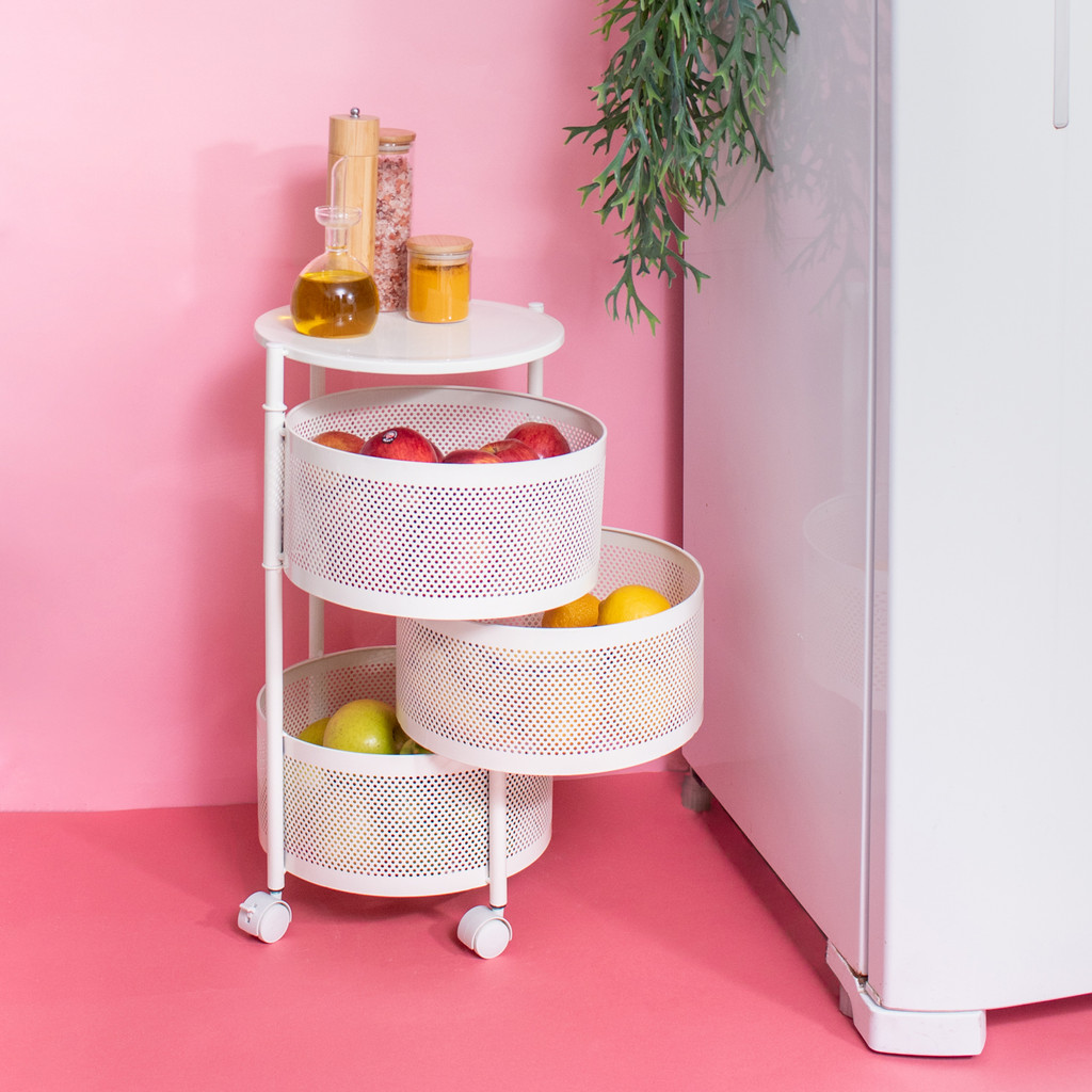 "conheça o gaveteiro giratório redondo com rodinhas da Oikos! para organizar frutas, pães, brinquedos, itens de banheiro e o que você quiser! Monte você mesmo: Super prático e fácil de montar. possui 3 gavetas e vem com rodinhas: Para levar a qualquer lugar. Tem sistema giratório 360°: Para facilitar o acesso às gavetas de qualquer ângulo. leve qualidade e modernidade para sua casa! medidas: comprimento: 28cm largura: 28cm altura: 57,5cm suporta até 15kg."