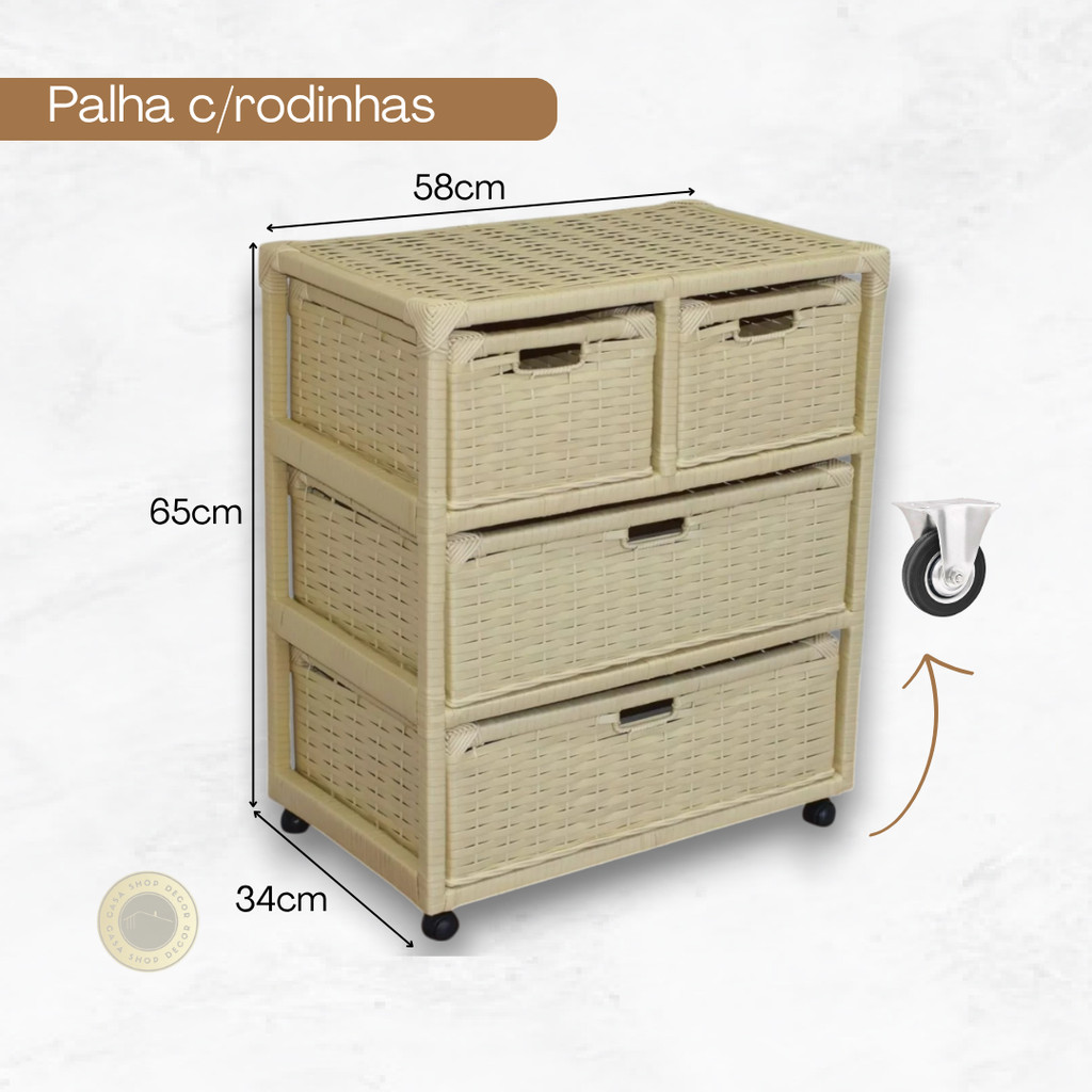 ✨ Organize com Elegância e Praticidade – Gaveteiro Luxo em Fibra Sintética ✨ Diga adeus à bagunça com um toque de sofisticação artesanal! Nosso gaveteiro de 4 gavetas é a solução definitiva para quem busca otimizar espaço sem abrir mão da estética. Ideal para quem precisa de um móvel resistente, leve e que já chega pronto para o uso em sua casa. ✅ DIFERENCIAIS QUE FAZEM A DIFERENÇA: 🚚 SEM MONTAGEM: Esqueça manuais complicados. Retire da caixa e comece a organizar agora mesmo! 💧 RESISTENTE À UMIDADE: Por ser de fibra sintética, é perfeito para banheiros e lavanderias (não embolora como o vime natural). 🧼 LIMPEZA EXPRESS: Um pano úmido e pronto! Higiene total para suas roupas e objetos. 💪 ESTRUTURA REFORÇADA: Base em madeira de qualidade com acabamento impecável em fibra sintética reciclável. COM RODINHAS INSTALADAS 🏠 ONDE USAR? Quarto: Como criado-mudo alto ou para organizar roupas íntimas e meias. Banheiro/Lavabo: Para toalhas, estoques de papel higiênico e cosméticos. Escritório: Perfeito para folhas A4, documentos e materiais de papelaria. Quarto de Bebê: Ideal para organizar fraldas e itens de higiene. 📏 ESPECIFICAÇÕES TÉCNICAS: Largura (Frente): 58cm Profundidade (Lateral): 34cm Altura Total: 65cm Material: Estrutura em madeira / Revestimento em Fibra Sintética. ⚠️ Aviso: Por ser uma peça artesanal feita à mão, pode haver pequenas variações de milímetros ou na tonalidade da cor, o que torna cada produto exclusivo!