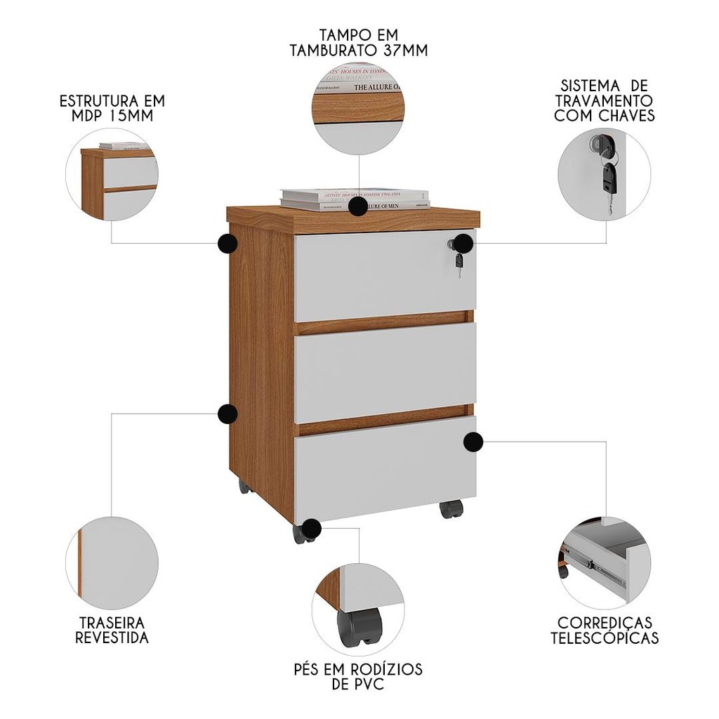 Gaveteiro para Escritório com Rodízios Corp A06 Freijó/Branco - Mpozenato