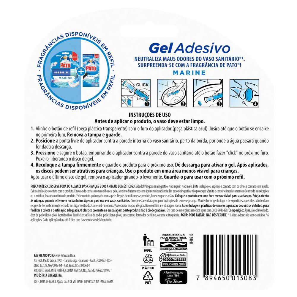 Pato Gel Adesivo é uma solução prática e higiênica que possui aplicador para evitar que o consumidor encoste no vaso sanitário e fórmula com escudo de proteção anti-manchas. Disponível nas fragrâncias regulares: Marine, Lavanda, Citrus.