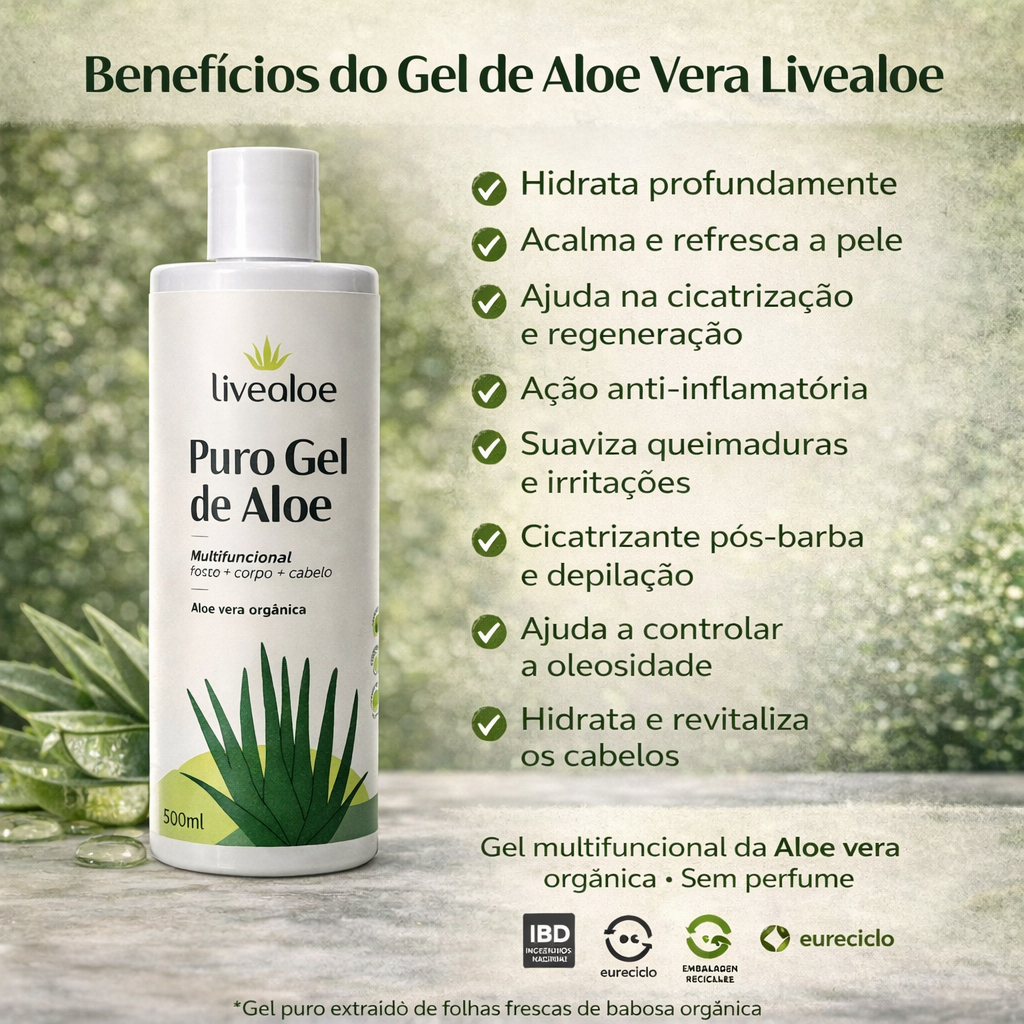 Gel Aloe Vera Organico Babosa Puro LIVEALOE 60ml/ 210ml/ 500ml/ 120ml - Testado Dermatologicamente