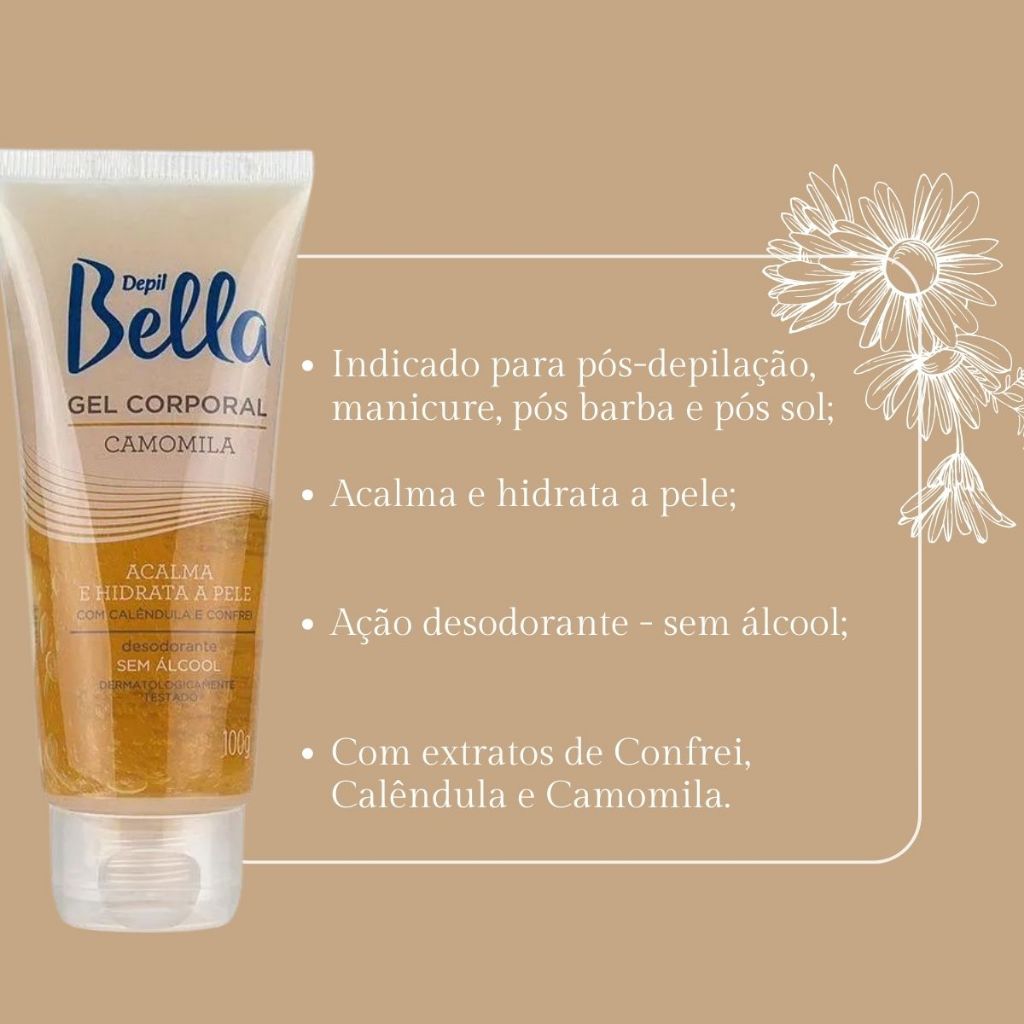 O GEL CORPORAL CAMOMILA DEPIL BELLA não contém álcool. É enriquecido com extratos de confrei, calêndula e camomila. Proporciona agradável sensação calmante e hidratante durante a aplicação. Com ação Desodorante. Indicação: Pós-depilação, manicure, pós-barba e pós sol. Principais ativos: Camomila, calêndula e confrei. Sugestão de aplicação: Aplicar sobre a pele, massageando suavemente, com movimentos circulares, até a total absorção do produto. Precauções: Evite o contato com os olhos e mucosas. manter fora do alcance de crianças, ao abrigo da luz e calor. Uso Externo. Dermatologicamente testado.