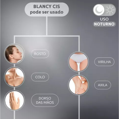 O que é e para que serve? Blancy Cis é um clareador de textura gel creme, que reduz as desordens pigmentares, promovendo melhor uniformização do tom da pele. Produto de uso noturno que pode ser usado no rosto, colo, dorso das mãos, virilha e axila. Benefícios: - Resultado visível em 4 semanas; - Uniformiza o tom da pele; - Redução das áreas acometidas; - Hidrata e ilumina a pele. Ativos: - Cisteamina Nanoencapsulada, ativo inovador que promove a redução da produção de melanina, diminuindo as áreas mais pigmentadas na pele; - Azeloglicina, Niacinamida e Resveratrol Nanoencapsulado que juntos agem visivelmente na melhora da aparência e tonalidade da pele. Modo de Uso: Aplique uma fina camada do produto no rosto após higienização da pele. Usar uma vez ao dia, à noite ou conforme orientação médica. Durante o uso do produto, recomenda-se o uso de protetor solar. Dermatologicamente e oftalmologicamente testado.