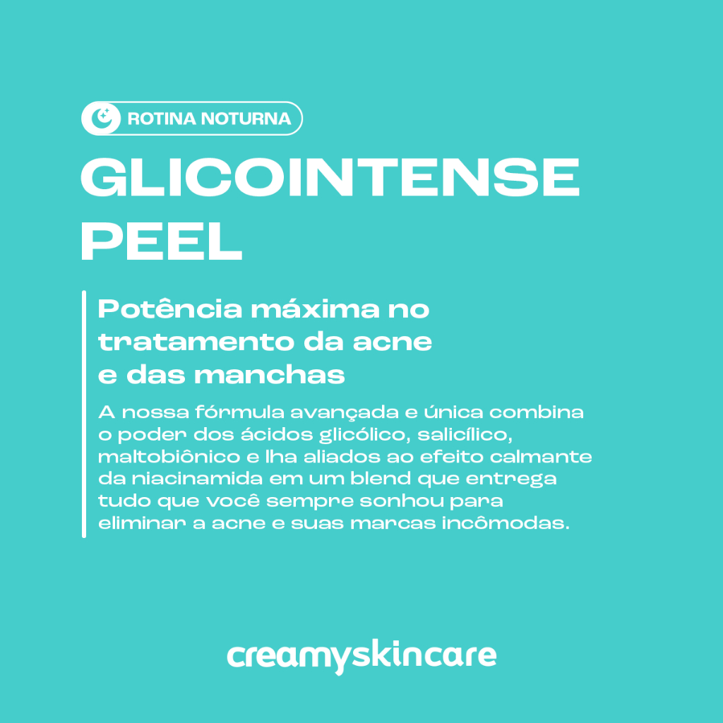 O que é? O Glicointense Peel traz o ácido glicólico em sua concentração máxima, associado ao ácido salicílico, ácido maltobiônico e LHA. O resultado dessa combinação exclusiva de ácidos potentes, que juntos somam uma concentração impressionante de 18,5%, é um efeito peeling poderosíssimo, jamais visto em dermocosméticos. Essa fórmula auxilia no controle da oleosidade excessiva, no clareamento de manchas, na redução dos poros dilatados e no cuidado da pele com acne. Conta ainda com a Niacinamida, que garante efeito calmante, reduzindo o desconforto da pele. Possui textura leve de rápida absorção, com acabamento não pegajoso, ideal para todos os tipos de pele, especialmente as muito oleosas.