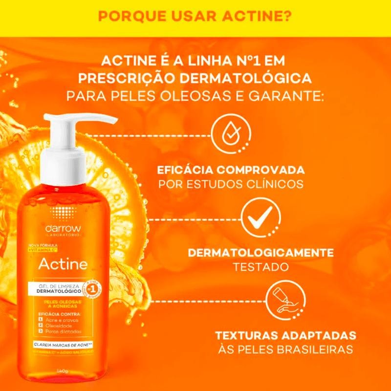 O gel de limpeza Darrow Actine é um grande aliado no tratamento da pele oleosa e acneica. Conta com fórmula inovadora com Vitamina C combinada com ativos dermatológicos antioleosidade e antiacne [Ácido salicílico 2% + P-refinyl + Lactato de mentila], que age profundamente na limpeza da pele, reduz a oleosidade, combate acne e cravos e minimiza poros dilatados, além de ajuda a clarear visivelmente as marcas de acne. Com textura gel refrescante, o gel Darrow Actine foi criado para garantir uma pele limpa, uniforme, sem oleosidade e impurezas o dia todo.