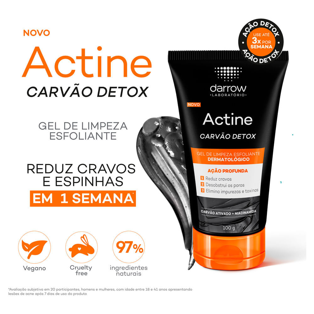 Actine Carvão Detox Gel de Limpeza Esfoliante Dermatológico Darrow Actine Carvão Detox Gel de Limpeza Esfoliante Dermatológico é um gel de limpeza esfoliante indicado para a limpeza das peles oleosas