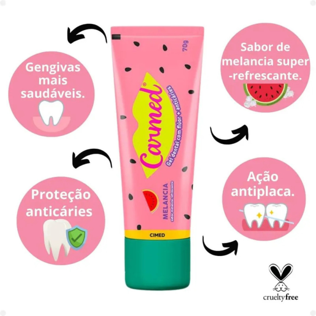 Gel dental c fluor Carmed Melancia 70grO Gel Dental Carmed sabor Melancia oferece uma limpeza eficaz e refrescante, combinando proteção bucal com um delicioso gostinho de cereja. Sua fórmula foi desenvolvida para ajudar a prevenir cáries, fortalecer os dentes e manter o hálito fresco, tornando a escovação mais prazerosa. Ideal para quem busca um sorriso saudável com um toque de sabor irresistível!