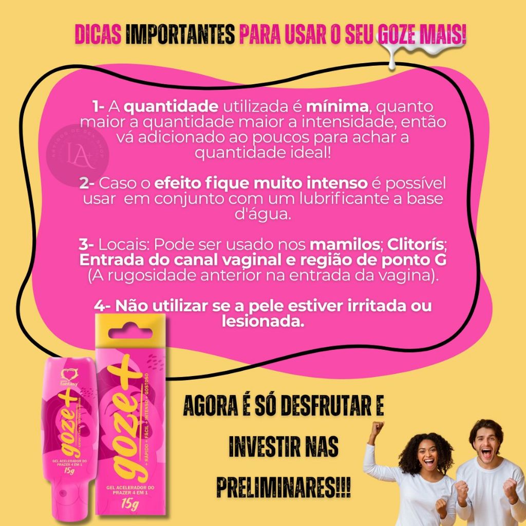O Goze+ é o companheiro ideal para mulheres que estão enfrentando dificuldades em chegar ao clímax. Esse gel incrível funciona como um acelerador do prazer, ajudando você a atingir o ápice de forma 4X mais rápida, fácil, intensa e gostosa. Quais são os benefícios do Goze+? Além de acelerar, ele também prolonga o prazer, graças a seus ativos que aumentam a excitação e a sensibilidade da região íntima. Com o Goze+, você chega ao orgasmo mais rápido e de forma muito mais intensa. Sua embalagem prática facilita a aplicação, e como é 4 vezes mais potente que outros produtos do mercado, ele entrega resultados poderosos em pouco tempo. O Goze+ não é apenas um estimulante, ele é uma verdadeira revolução no prazer feminino. Como usar o Goze+? A aplicação é simples e eficaz: • Aplique uma pequena quantidade nas pontas dos dedos, evitando exageros, especialmente se for sua primeira vez usando o produto. • Massageie suavemente o clitóris em movimentos circulares até que o gel seja completamente absorvido. Você também pode estender a aplicação para toda a vulva, incluindo os lábios internos e externos. • Para intensificar ainda mais, aplique o gel na entrada do canal vaginal e na região do ponto G, que fica a 3 a 5 cm na parte superior do canal, utilizando o dedo indicador voltado para cima durante a aplicação. • O Goze+ pode ser espalhado em um brinquedo erótico ou nas áreas íntimas do seu parceiro(a) para elevar ainda mais o prazer. • Se achar que o efeito é muito intenso, experimente usar o Goze+ junto com um lubrificante íntimo para suavizar as sensações. E para quem gosta de variar, o Goze+ também está disponível na versão bolinhas, perfeito para experimentar novas formas de prazer! Com o Goze+, alcançar o orgasmo nunca foi tão fácil e prazeroso. Experimente e descubra uma nova dimensão de prazer! Ficha Técnica • Contém: 01 Gel 15g; • Embalagem: Frasnaga; • Validade: Presente na embalagem; Composição Aqua, Sodium Polyacrylate, Glycerin, Phenoxyethanol, Methylisothiazolinone, BHT, Hydrogenated Polydecene, Zingiber Officinale Extract, Trideceth-6, Ginkgo Biloba Leaf Extract, Pfaffia Glomerata Root Juice, Isopropyl Palmitate, Ptychopetalum Olacoides Bark/Root Extract, Cinnamomum Cassia Leaf Oil, Aroma, Aldehyde Cinnamique, Eugenol, Linalool.