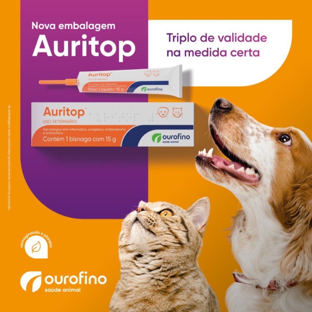 A MANADA ANIMAL é um marketplace de produtos veterinários. É a escolha certa para tutores que prezam pela qualidade dos produtos que seu animal necessita. Tudo com o suporte de uma equipe de veterinários e gestores com mais de 10 anos de experiência no mercado. Fique tranquilo, todos os nossos produtos são originais, adquiridos através de distribuidores credenciados! Ah, e todas as vendas acompanham nota fiscal! MANADA ANIMAL, Tranquilidade pra você, cuidado para ele! _____________________________________ Fórmula: Cada 100,00 g contém: Ciprofloxacina (Cloridrato) ...................... 0,30 g* Cetoconazol ................... 1,00 g Acetonido de Fluocinolona ................... 0,02 g Cloridrato de Lidocaína ......................... 2,00 g Excipientes q.s.p. ...... 100,00 g * Equivalente a aproximadamente 0,35 g de Cloridrato de Ciprofloxacina Indicações: Auritop é indicado para cães e gatos, no tratamento de otites agudas ou crônicas causadas por fungos e/ou bactérias. Agentes etiológicos susceptíveis: Bactérias: Staphylococcus intermedius, Staphylococcus aureus, Staphylococcus epidermidis, Streptococcus canis, Streptococcus pyogenes, Proteus mirabilis, Proteus vulgaris, Pseudomonas aeruginosa, Escherichia coli. Fungos: Mallassezia pachydermatis, Microsporum canis, Trichophyton rubrum, Trichophyton mentagrophytes, Candida albicans. Modo de Uso e Dosagem: Auritop é um produto para utilização tópica que deve ser aplicado no canal auditivo externo, após a limpeza do mesmo para remoção de todo o excesso de cerúmen e outras sujidades, conforme dosagem presente na bula.