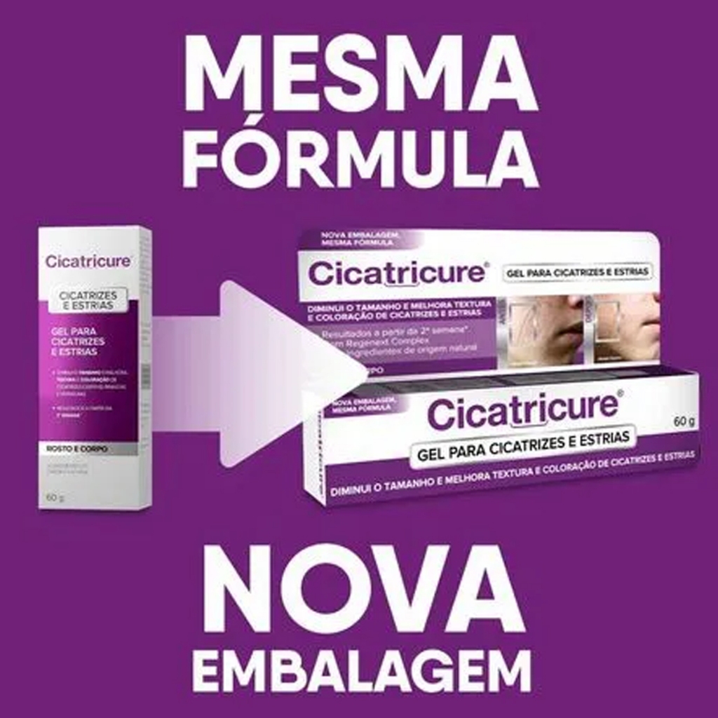 Gel Para Cicatrizes e Estrias Cicatricure 60g - 1 unidade O cicatricure gel para cicatrizes e estrias é eficaz no tratamento da pele com cicatrizes (cicatrizes e não queloides menores a um ano) de cirurgias, lesões, queimaduras e acne, além de estrias brancas e vermelhas. Hidrata intensamente, recuperando a elasticidade da pele. Modo de uso: Aplique quatro vezes ao dia sobre a região afetada, massageando até a completa absorção. Recomenda-se dois meses de uso contínuo para o tratamento completo. Principais benefícios: - Diminui o tamanho e mlehora a textura e coloração de cicatrizes e estrias. - Resultados a partir da 2ª semana de uso. - Melhora da elasticidade, hidratação e aspecto da pele com estrias e cicatrizes. Precauções: Para uso externo. Não aplique sobre a pele lesionada ou irritada. Caso haja qualquer efeito indesejado suspenda o uso. Manter fora do alcance de crianças. Não aplicar em feridas que não tenham cicatrizado totalmente. Evitar o uso em contorno dos olhos, genitais externos, lábios e a exposição direta e prolongada do sol.
